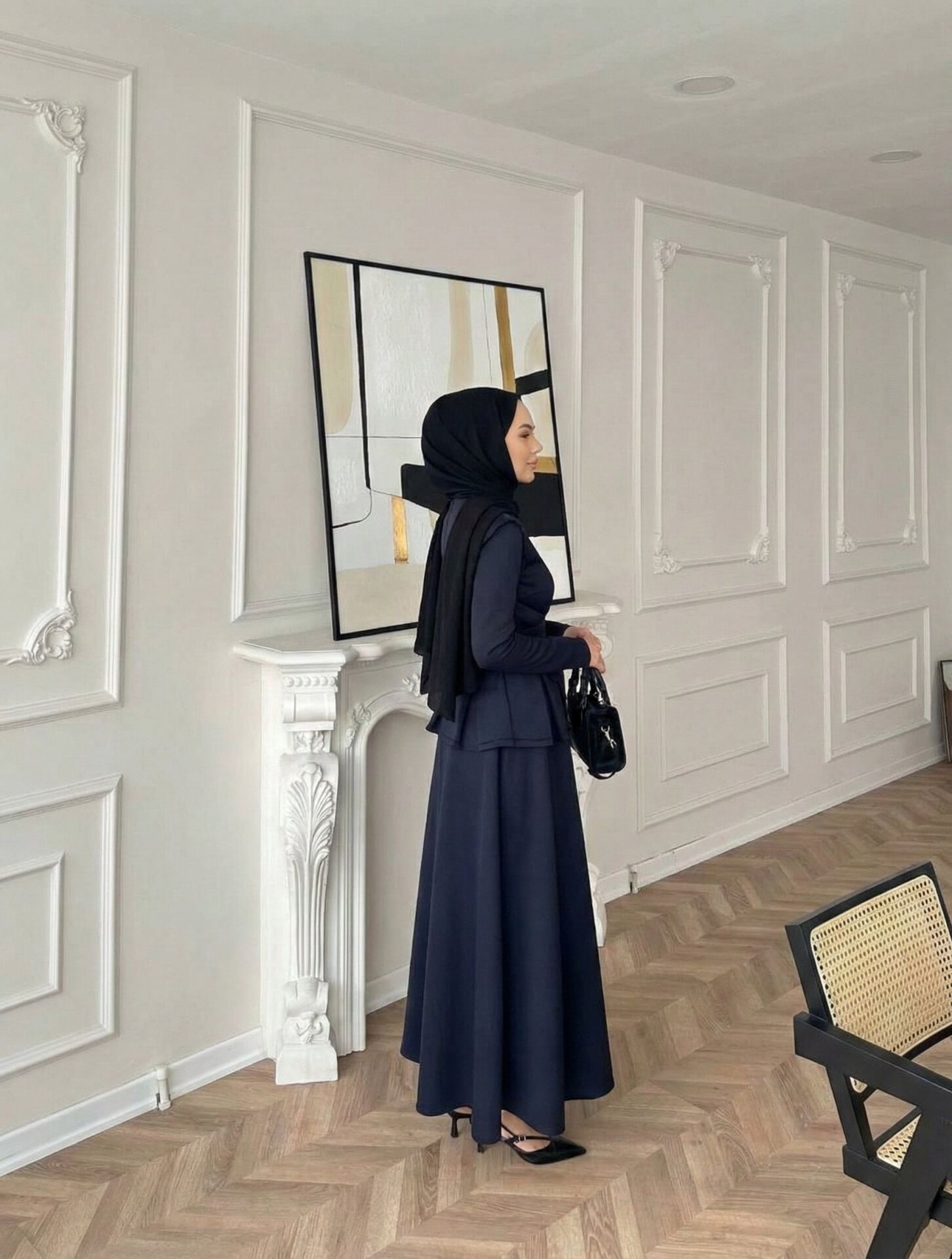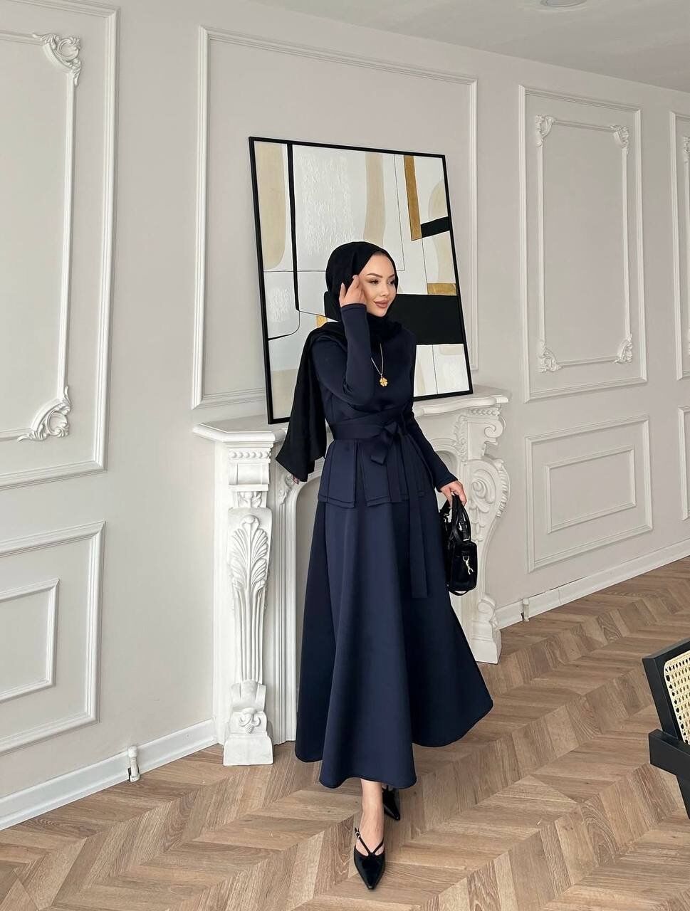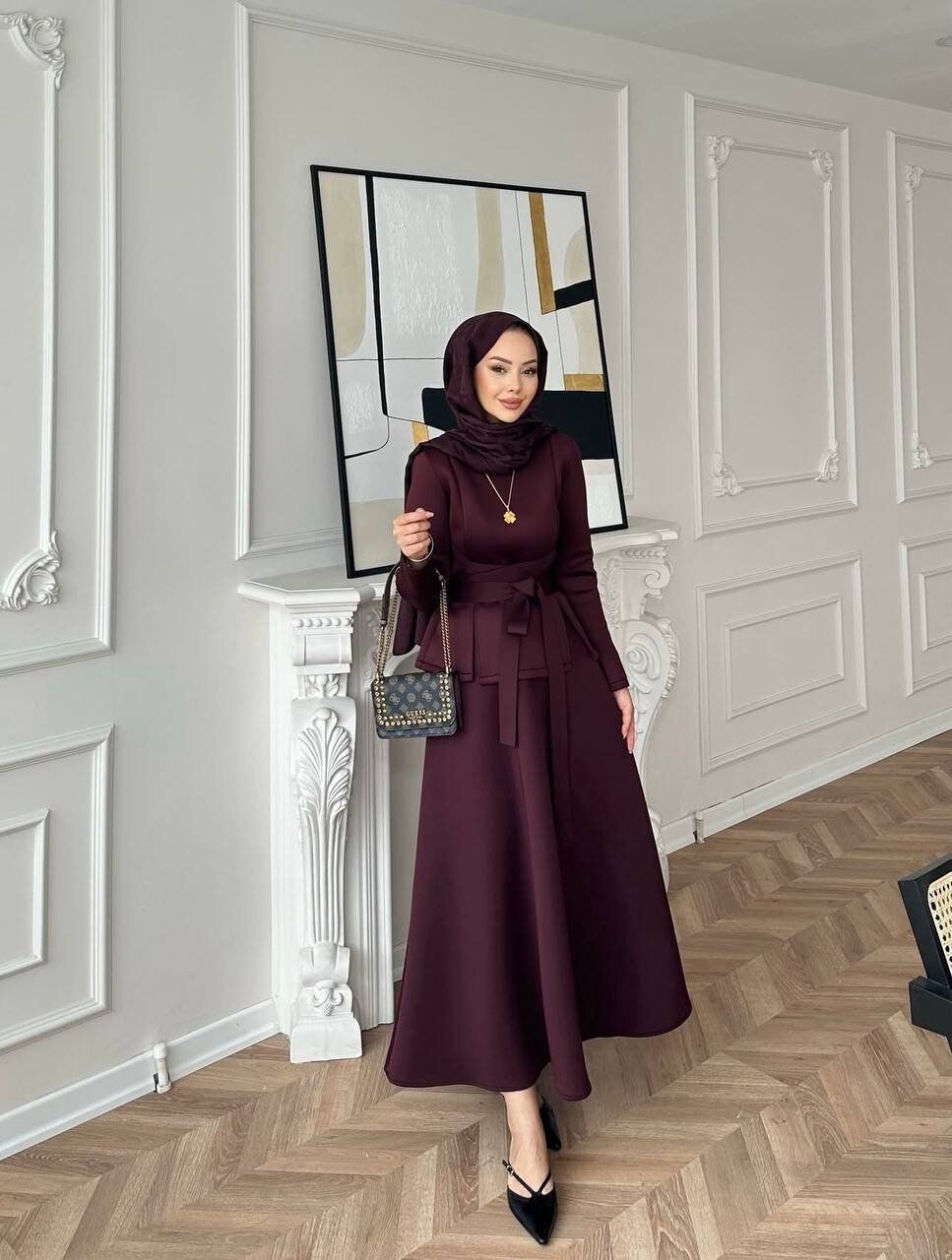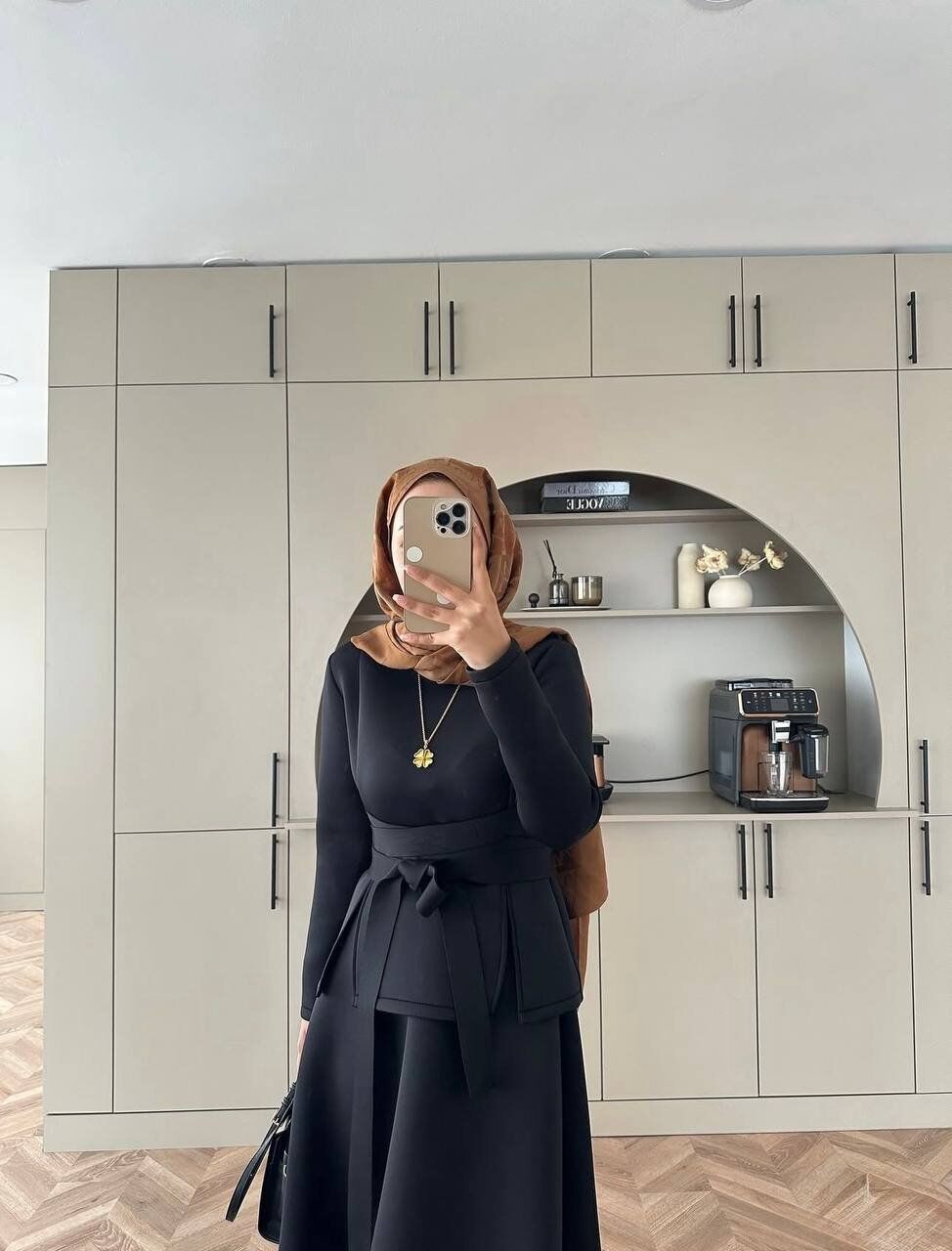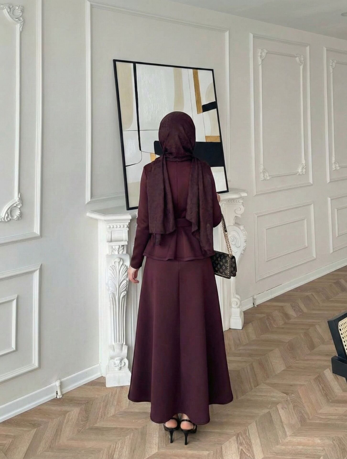 Zarif duruşu ve konforlu yapısıyla dolabınızın favorisi olmaya aday! Scuba (dalgıç) kumaşın verdiği tok ve pürüzsüz görünüm, gün boyu şıklığınızı korumanızı sağlar. Belden oturtmalı ve seyyar kuşaklı üst parça, modern peplum kesimiyle feminen bir silüet oluştururken; kloş kesim etek, hareket özgürlüğü ve asil bir duruş sunar. İster ofis şıklığında ister özel davetlerde rahatlıkla tercih edebilirsiniz.