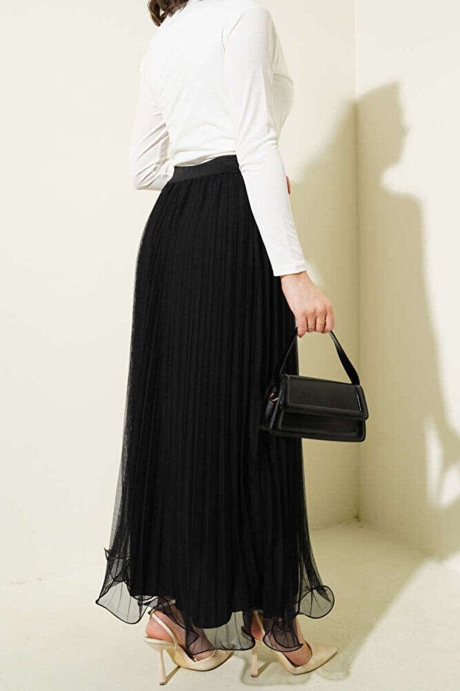 Bel Lastikli Pileli Fırfırlı Tül Etek Siyah