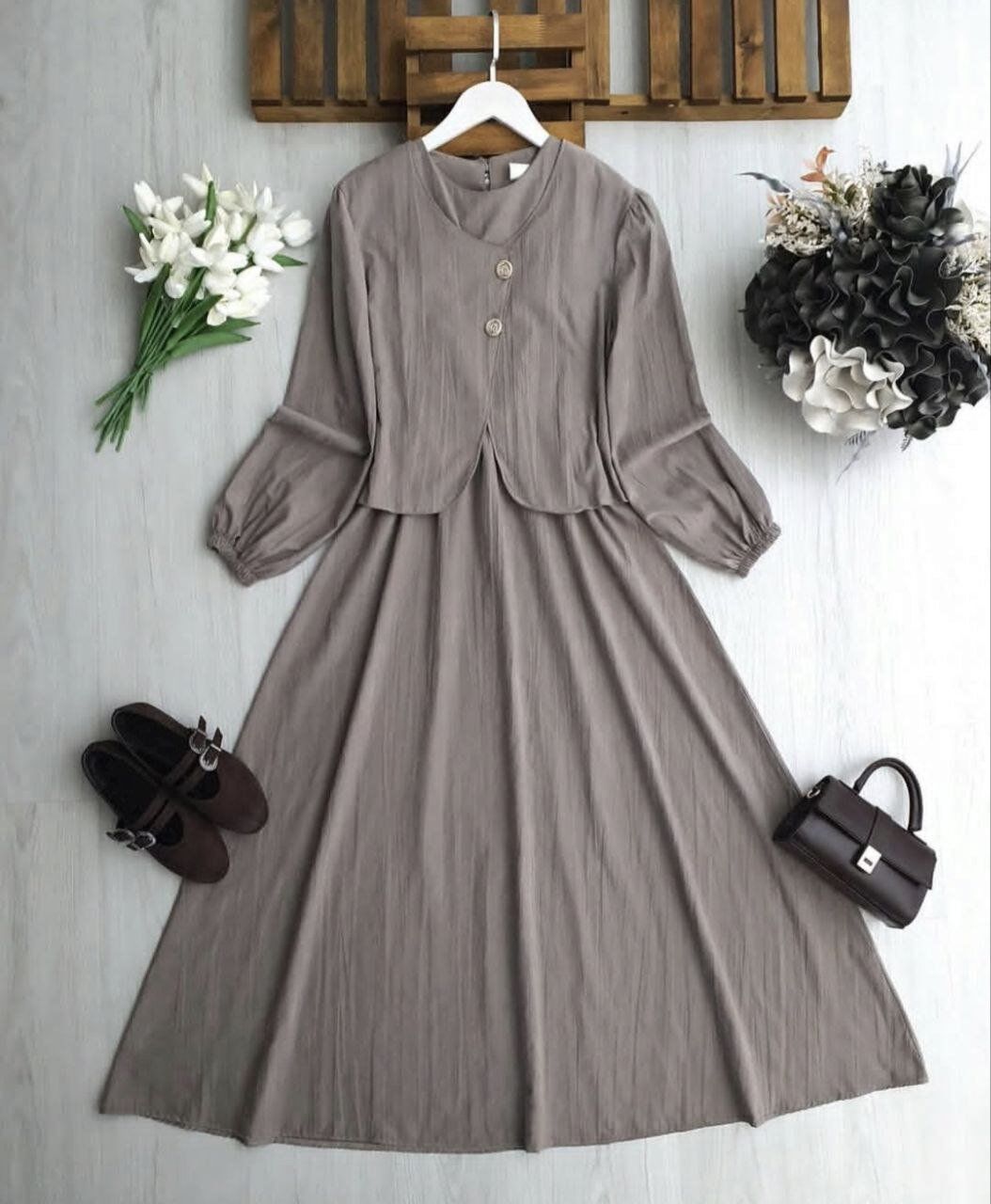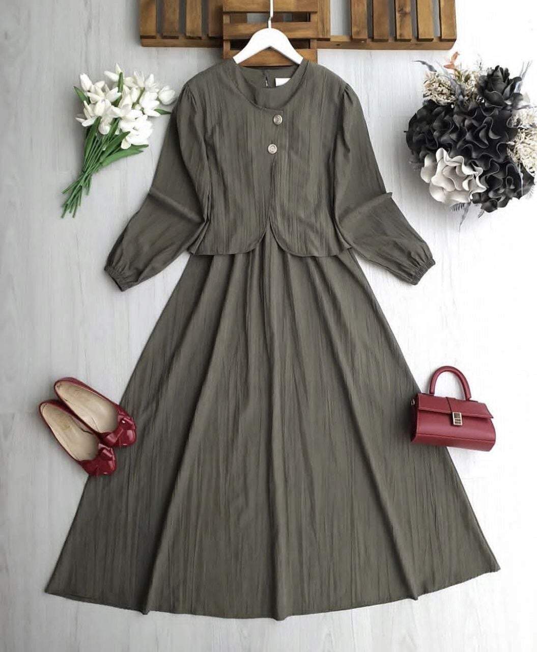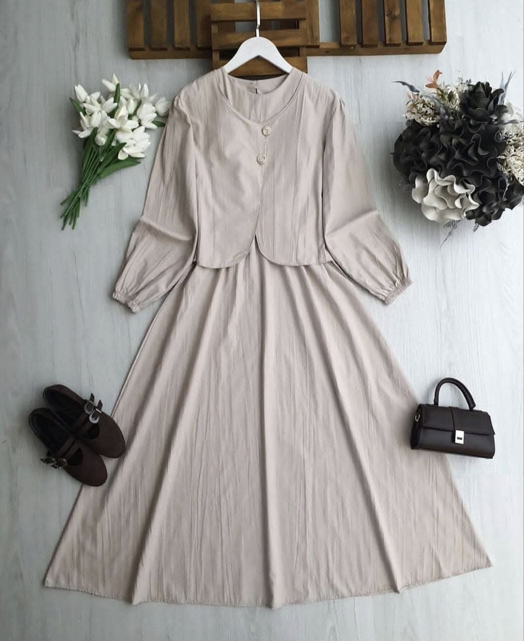 İkili Set: Belden lastikli rahat kesim sıfır kol elbise ve şık duruşlu asimetrik kesim bolero.