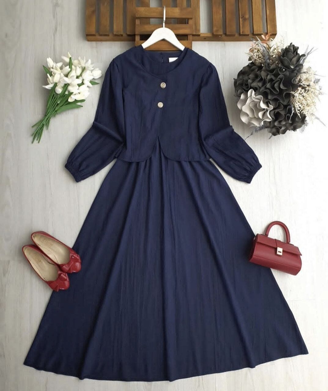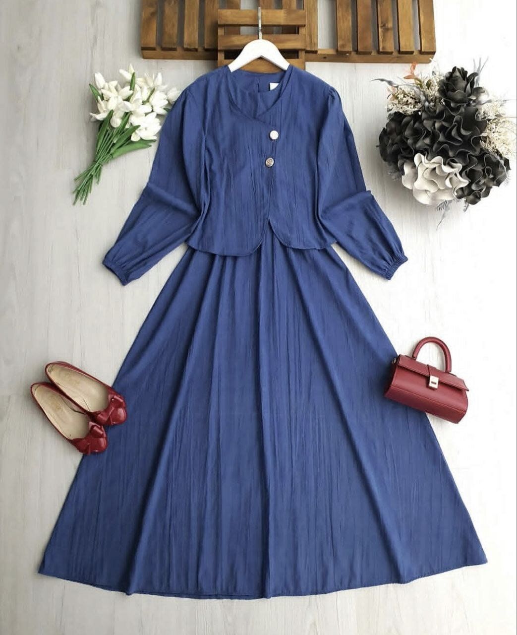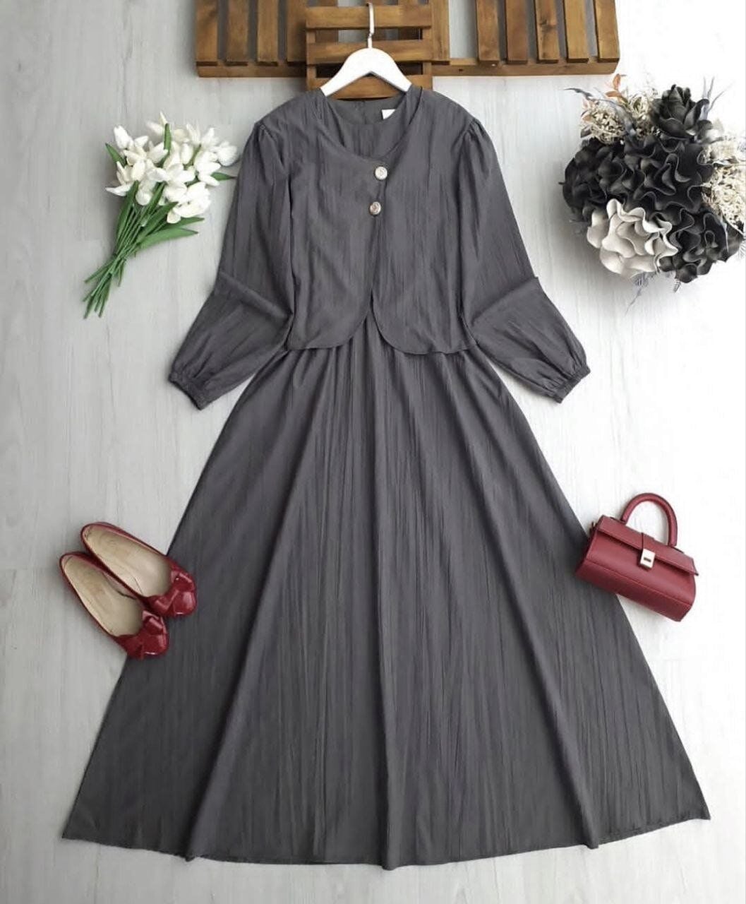 İkili Set: Belden lastikli rahat kesim sıfır kol elbise ve şık duruşlu asimetrik kesim bolero.