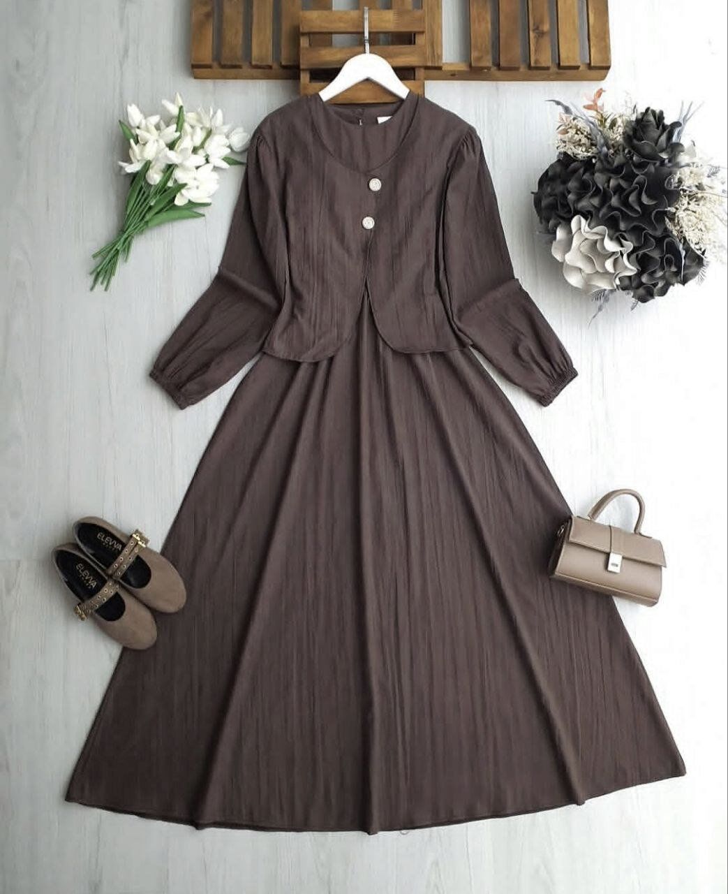 Hem günlük şıklıkta hem de özel davetlerde fark yaratacak bu set, Nubuk Cupra kumaşın asil dokusunu modern asimetrik kesimle birleştiriyor. İster takım olarak ister ayrı parçalarla kombinleyerek tarzınızı yansıtın.