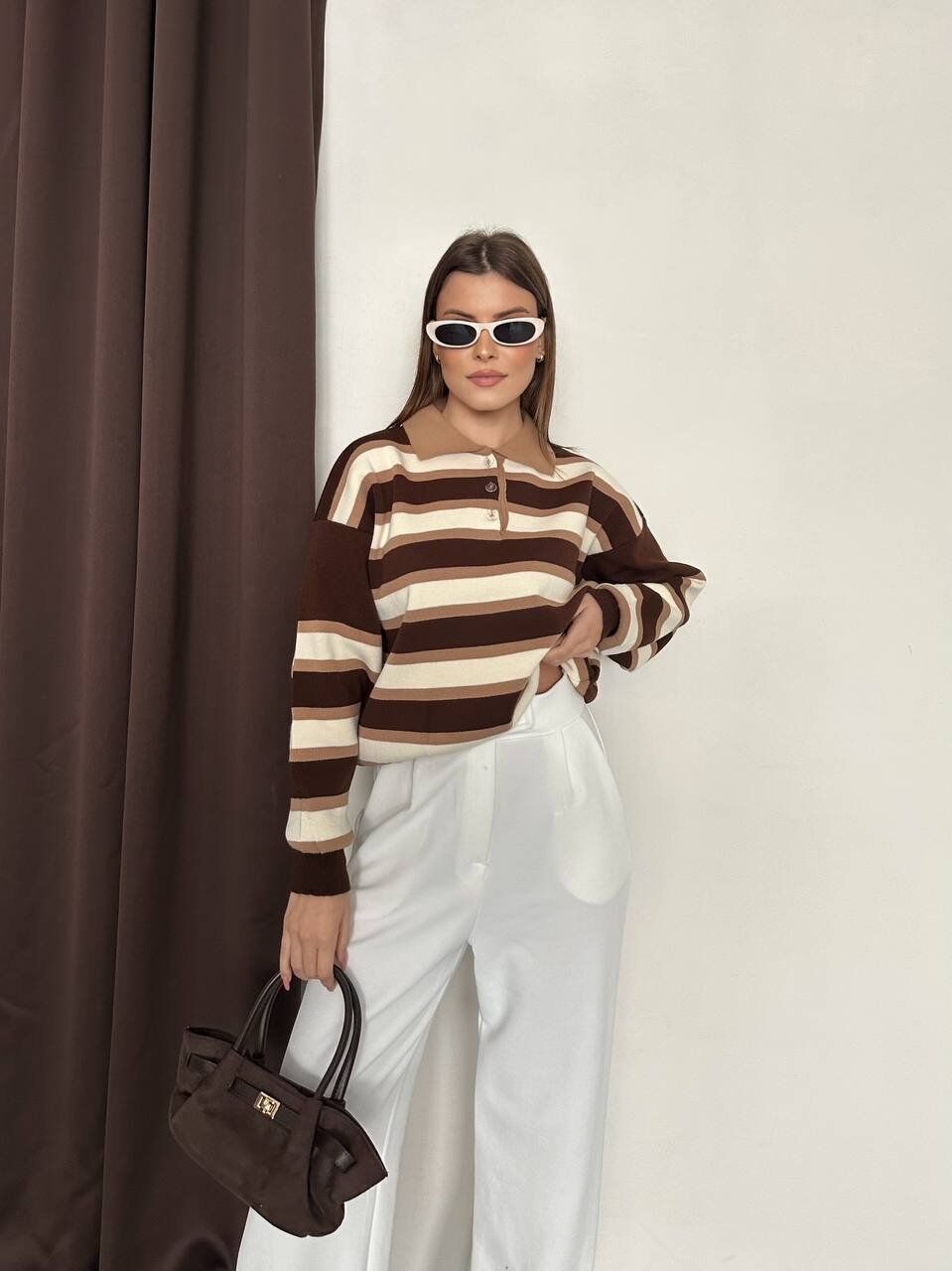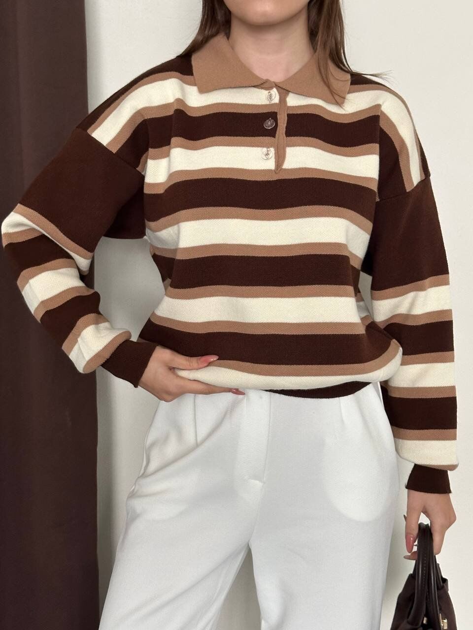 Sonbahar ve kış gardırobunuzun yeni gözdesi olmaya aday! Klasik kolej yaka stilini, modern ve canlı çizgilerle birleştiren bu kazak, zahmetsiz şıklığın anahtarı. Yumuşacık triko dokusu sayesinde gün boyu konfor sunarken, şık tasarımıyla tüm dikkatleri üzerinize çeker. Jean pantolonlardan kumaş eteklere kadar her parçayla kolayca uyum sağlar.