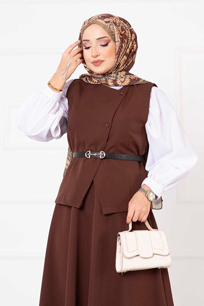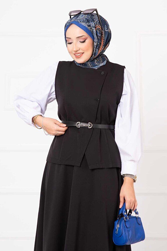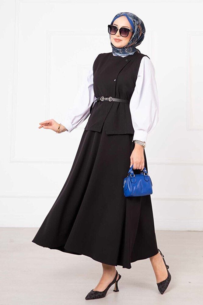 - Üç parçadan oluşan set; yelek, etek ve kemer içerir, böylece kombin yaparken ekstra kolaylık sunar.