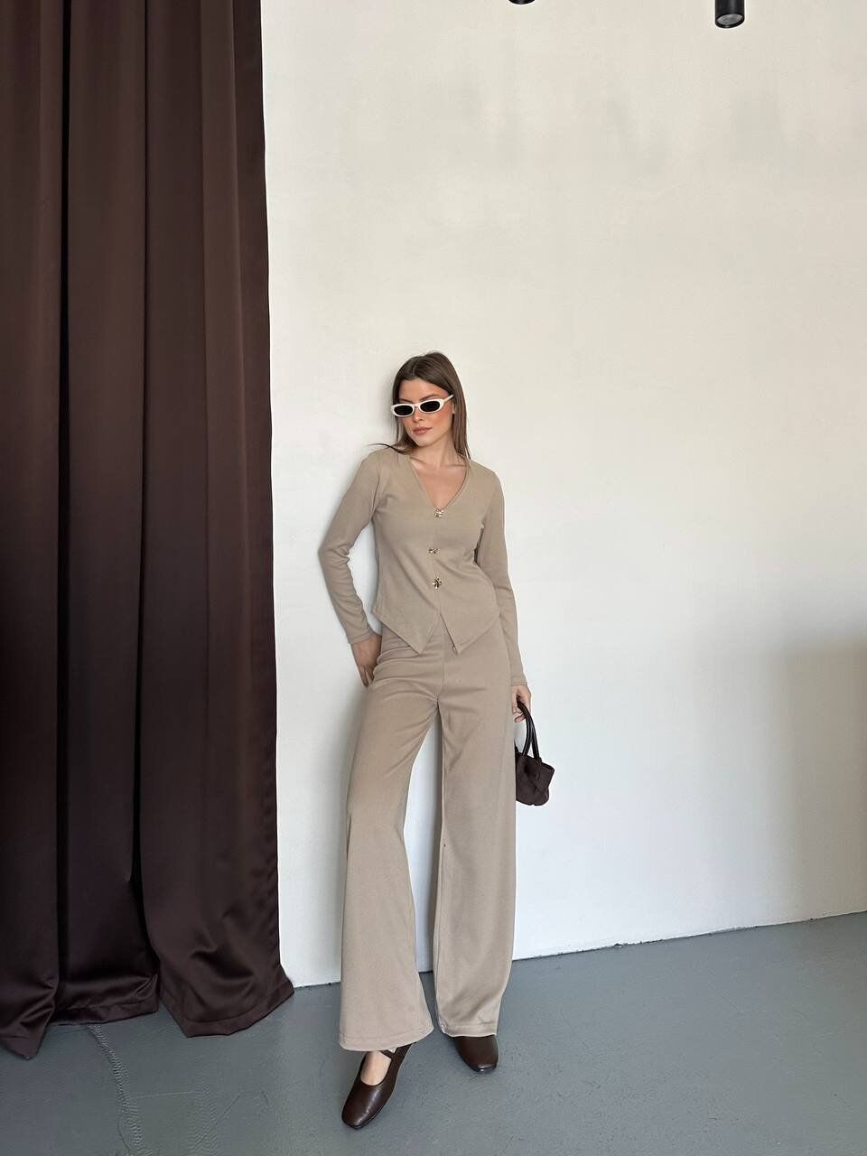 Alt Parça: Konforlu ve modern bir silüet yaratan, geniş paça (wide-leg) pantolon.