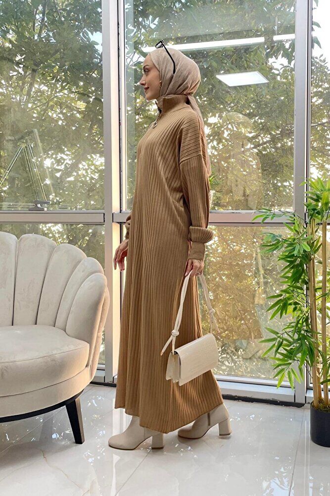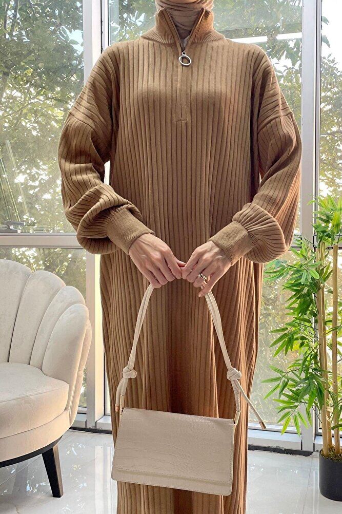 Fermuarlı Fitilli Triko Elbise