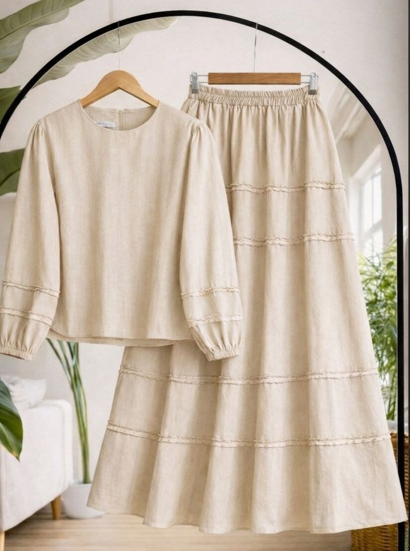 Tasarım Detayları: Gömlek kollarında ve etek katlarında yer alan ince fırfır detayları, takıma hareketli ve romantik bir hava katıyor.