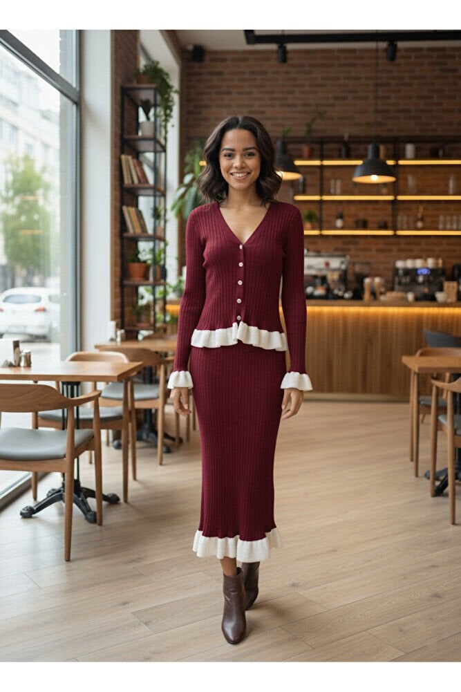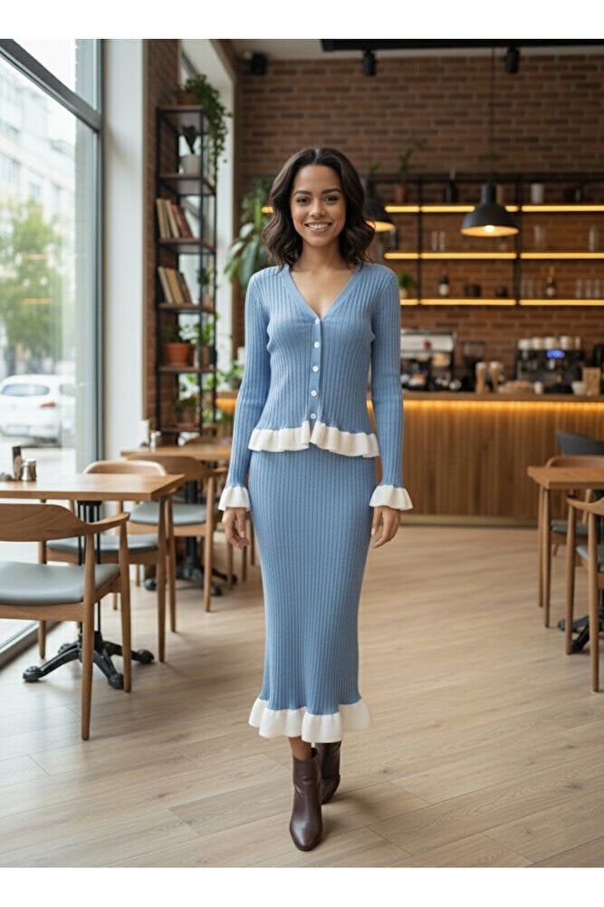 Fitilli Fırfır Detaylı Etek Bluz Triko Takım