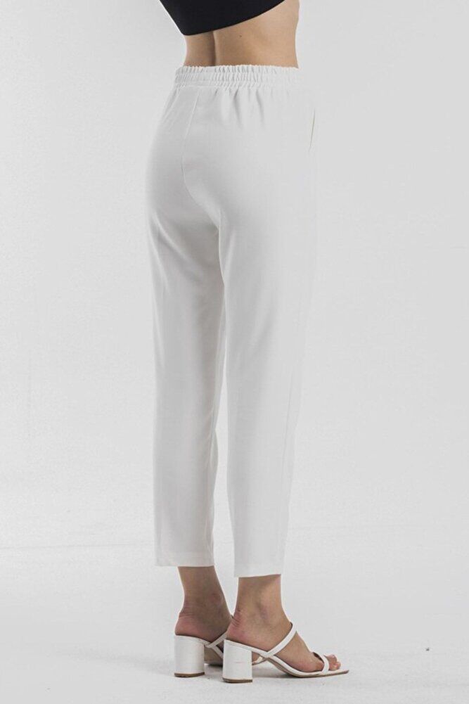 Beyaz havuç pantolon, Geniş beden aralığındadır,(38,48) iç göstermez kumaşa sahiptir, yazın rahatlıkla kullanabileceğiniz bir üründür, paça uzunluk boyu ayak bilek boyundadır; belden lastikli olup bağlamalı kemere sahiptir;