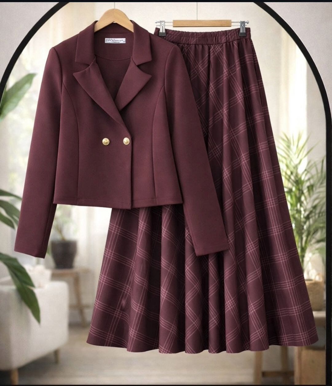 İthal Dalgıç Kumaş Kareli Etek & Kruvaze Ceket Takımı