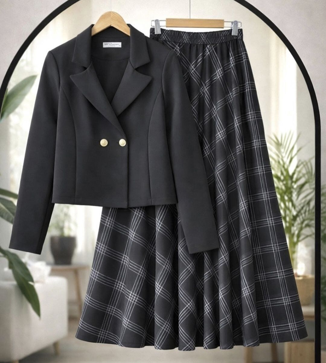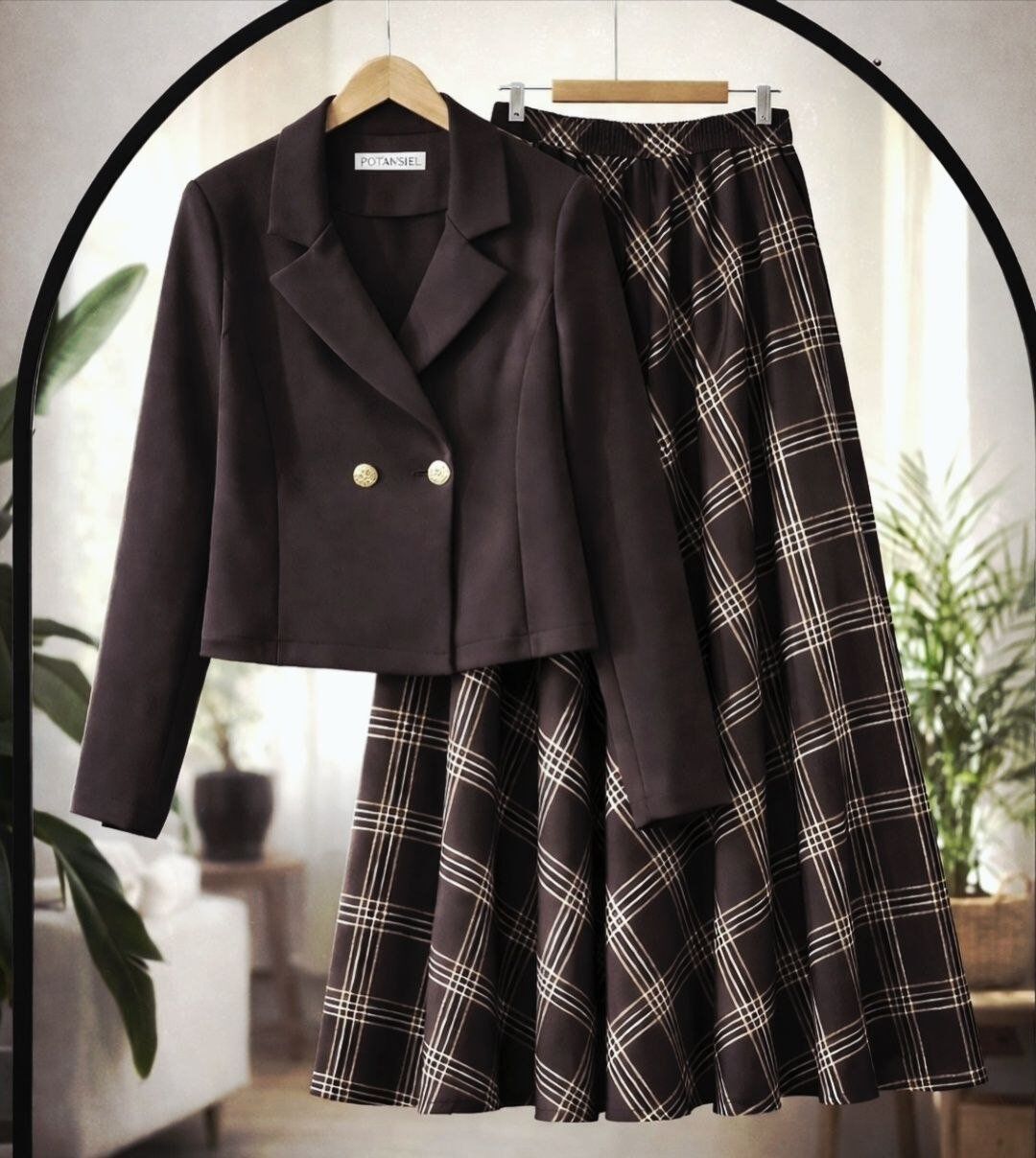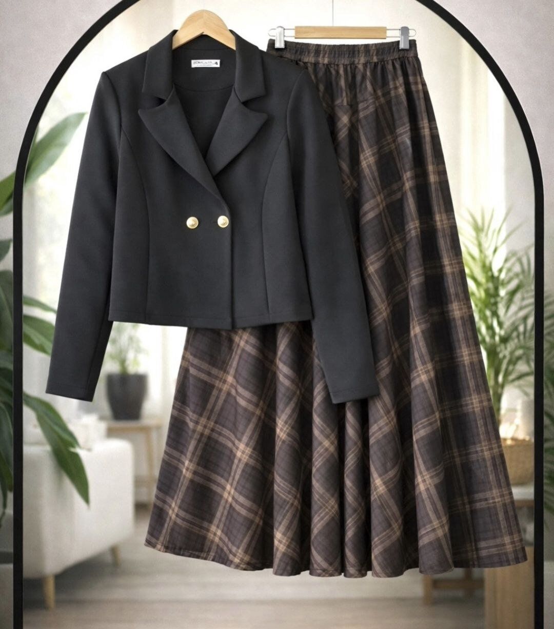 Kruvaze yaka ceketindeki gold düğme detayları modern bir hava katarken, kare desenli kloş etek zamansız bir stil sunuyor. Ütü gerektirmeyen yapısı ve esnek dokusuyla konforunuzdan ödün vermeden şıklığı yakalayın.