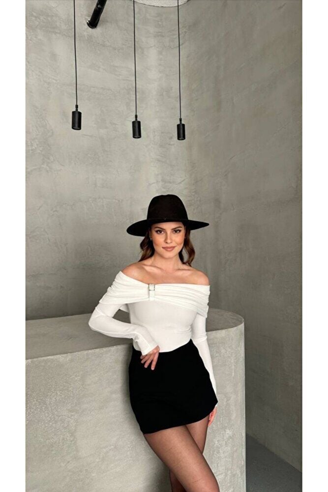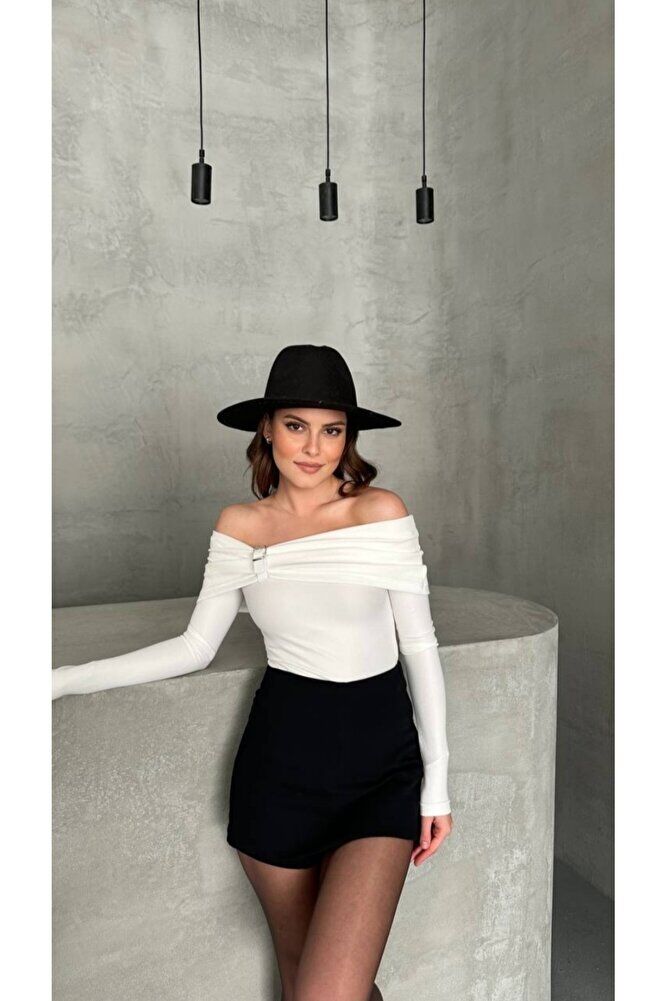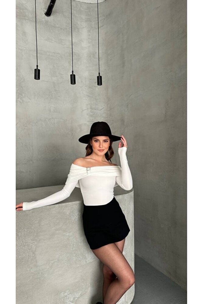 Kadın Kemer Detaylı Madonna Yaka Bluz