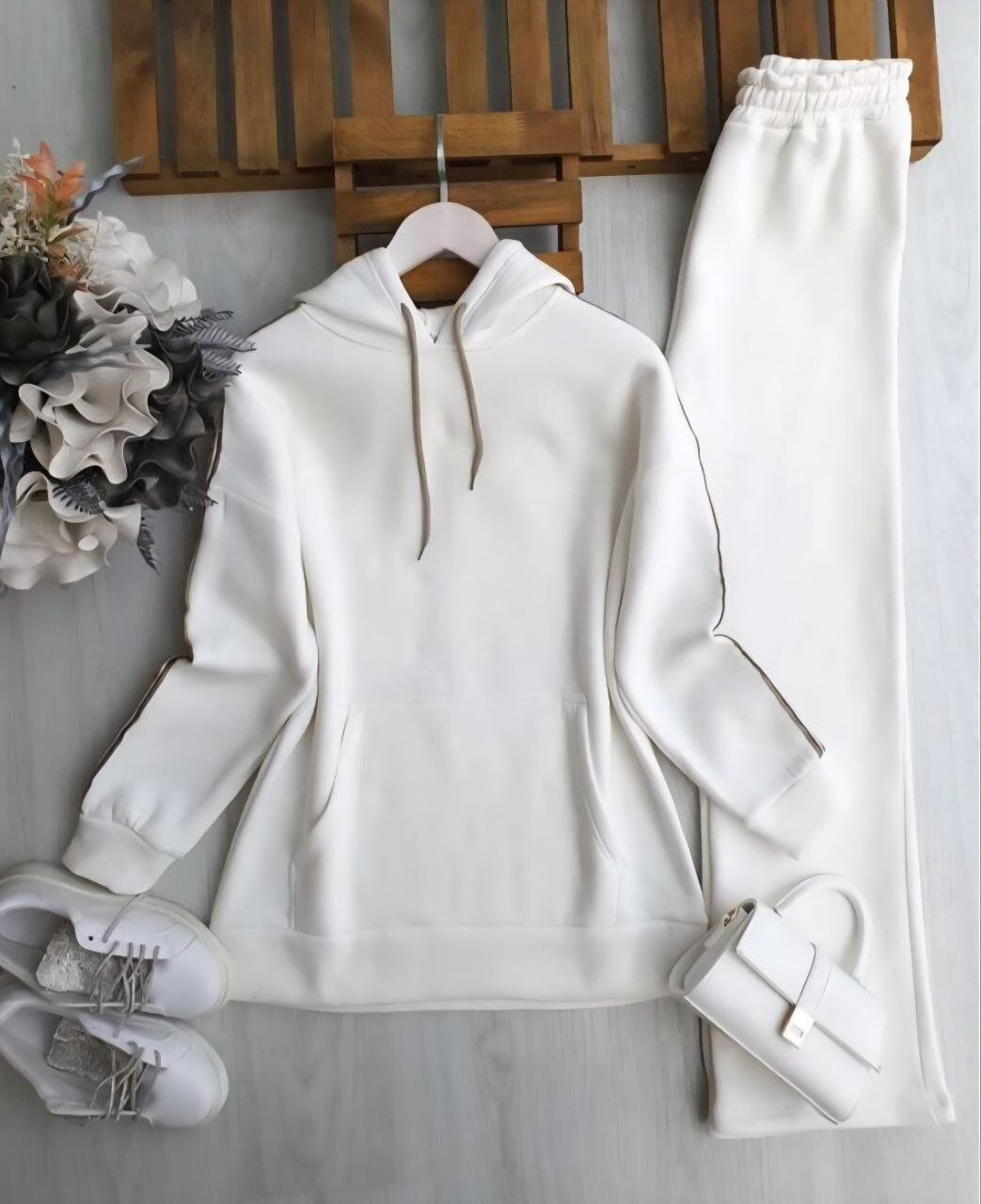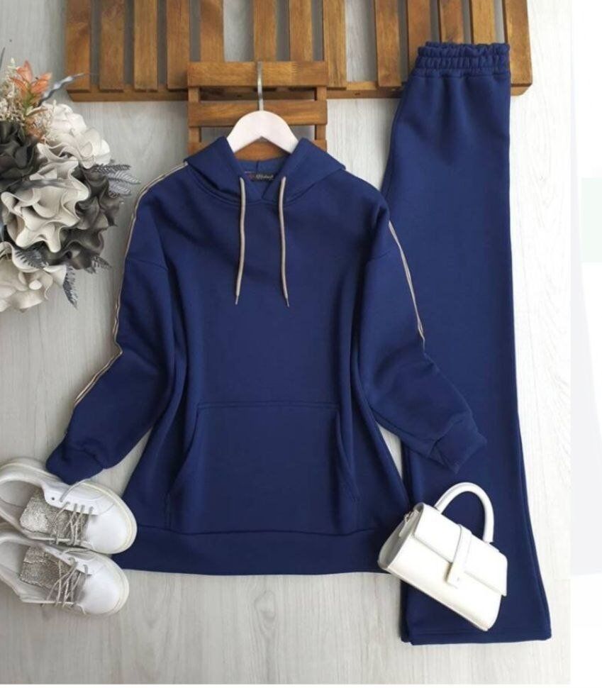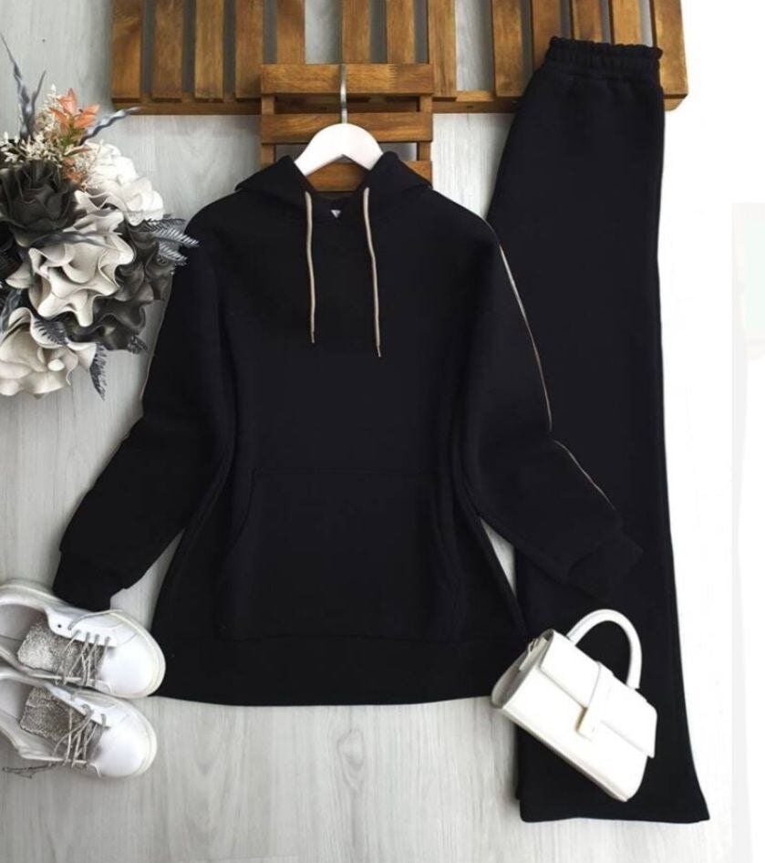 Kanguru cep detayı ve kollarındaki şık şerit biye tasarımıyla sportif bir görünüm sunar. Pantolon beli lastiklidir ve kullanımı oldukça rahattır. Gün boyu konfor arayanlar için idealdir.