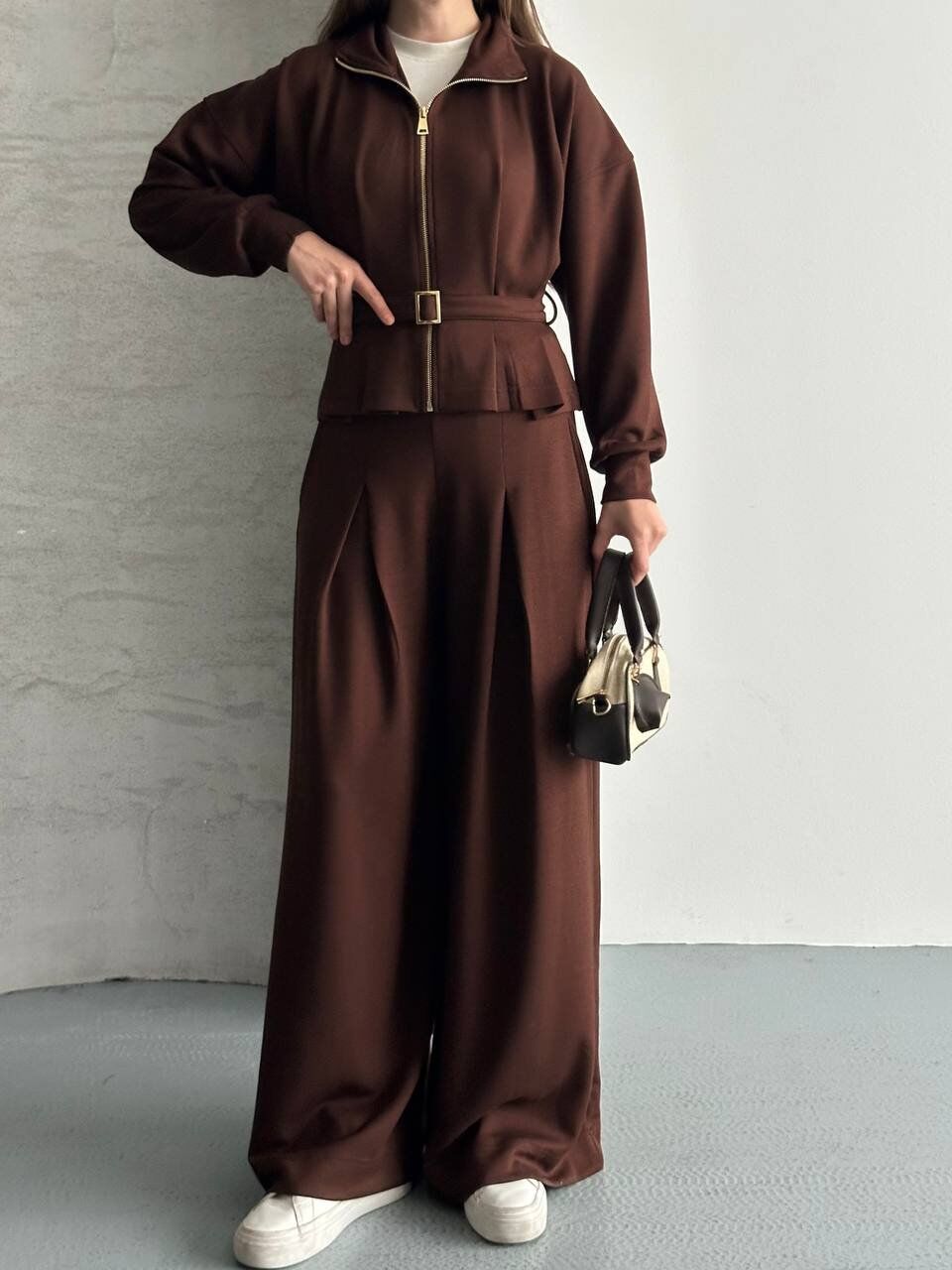 Set İçeriği: Fermuarlı/Kemerli Ceket ve Bol Paça Pantolon.