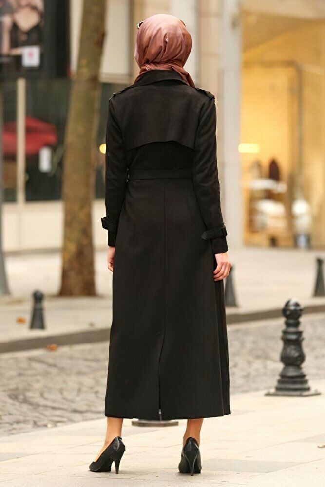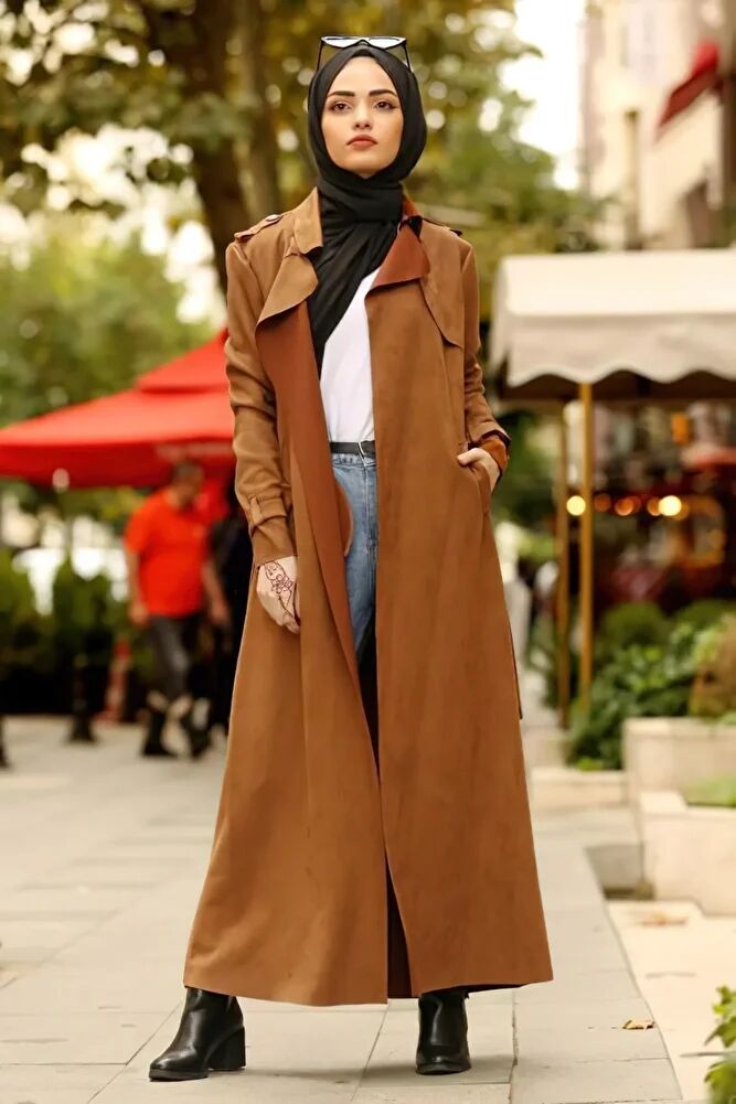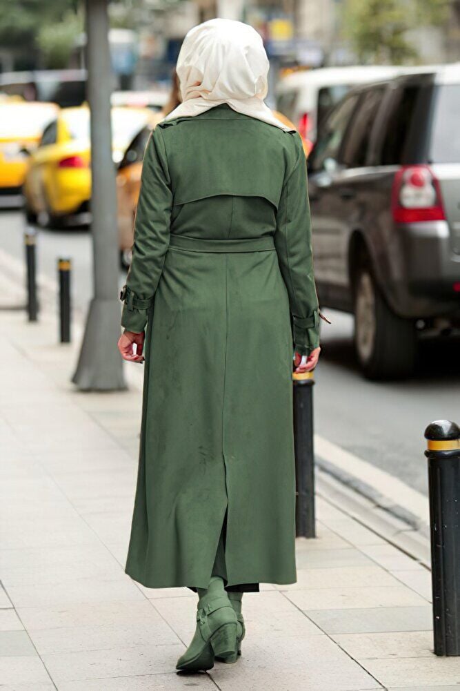 Kemerli Tam Boy Tesettür Süet Trençkot