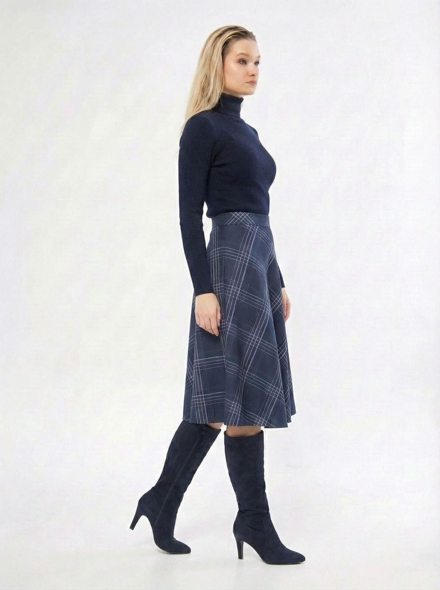 Vücut Orantısı: Yüksek bel tasarımı bacak boyunu daha uzun gösterirken, genişleyen etek ucu basenleri kamufle ederek ince bir bel görünümü sağlar.
