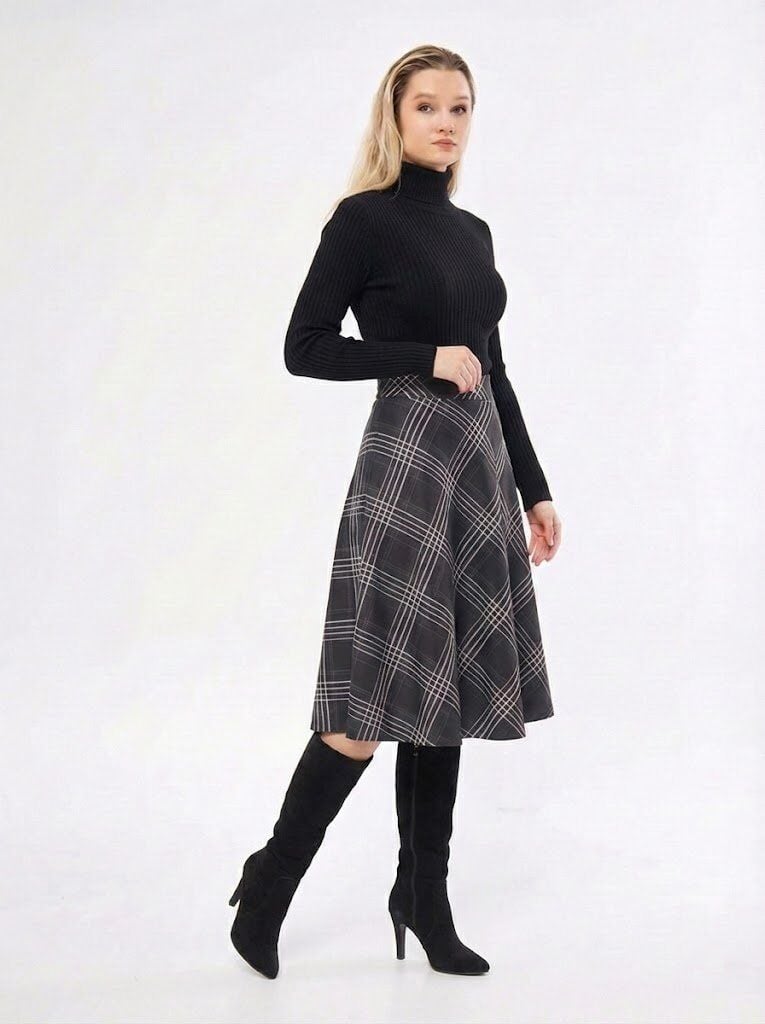Klasik Şıklık: Yüksek Bel Verev Kesim Ekose Midi Etek