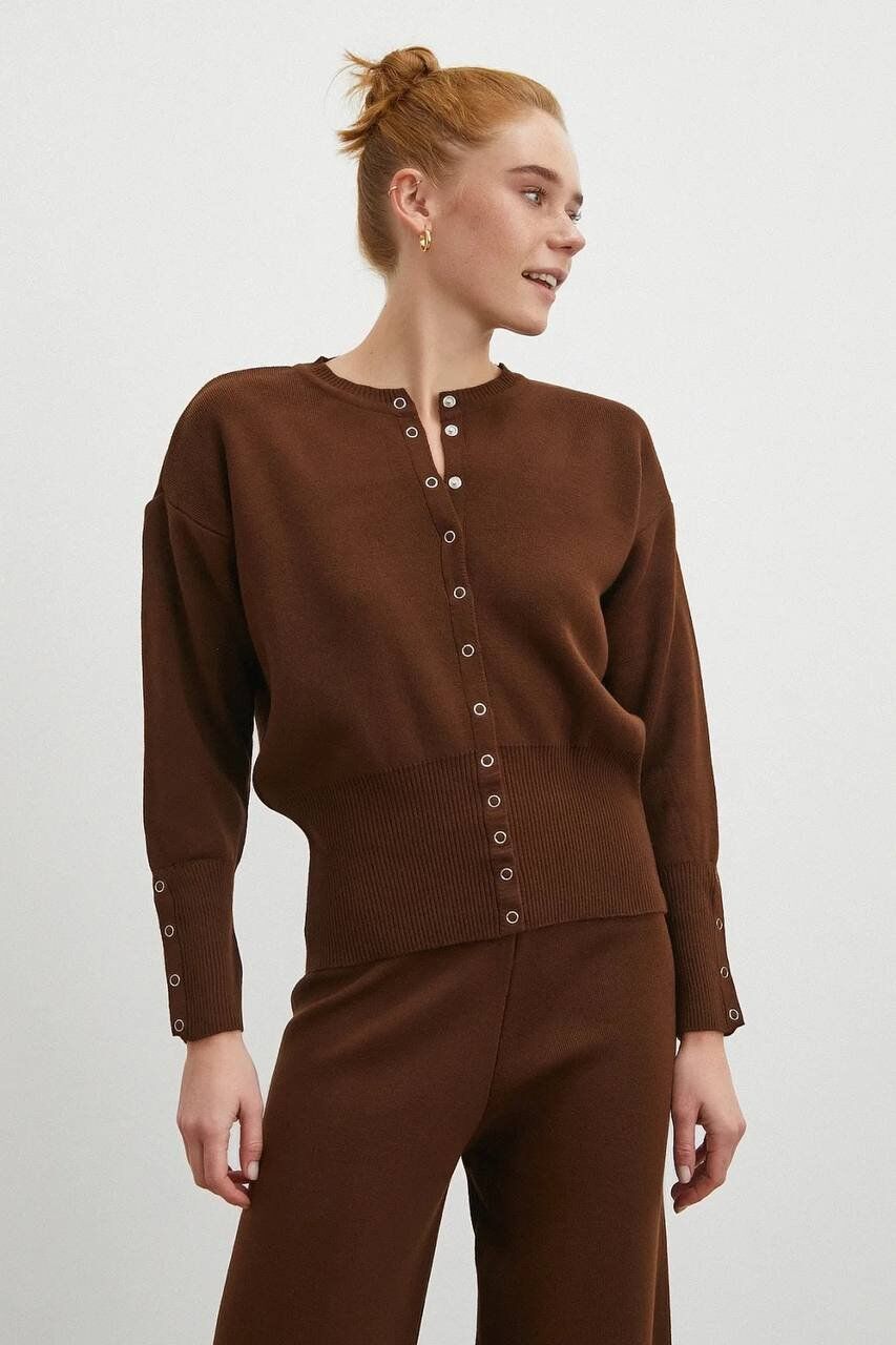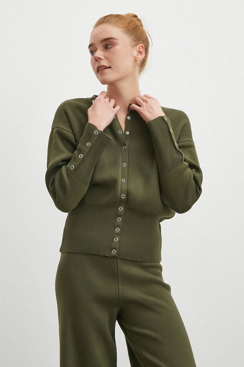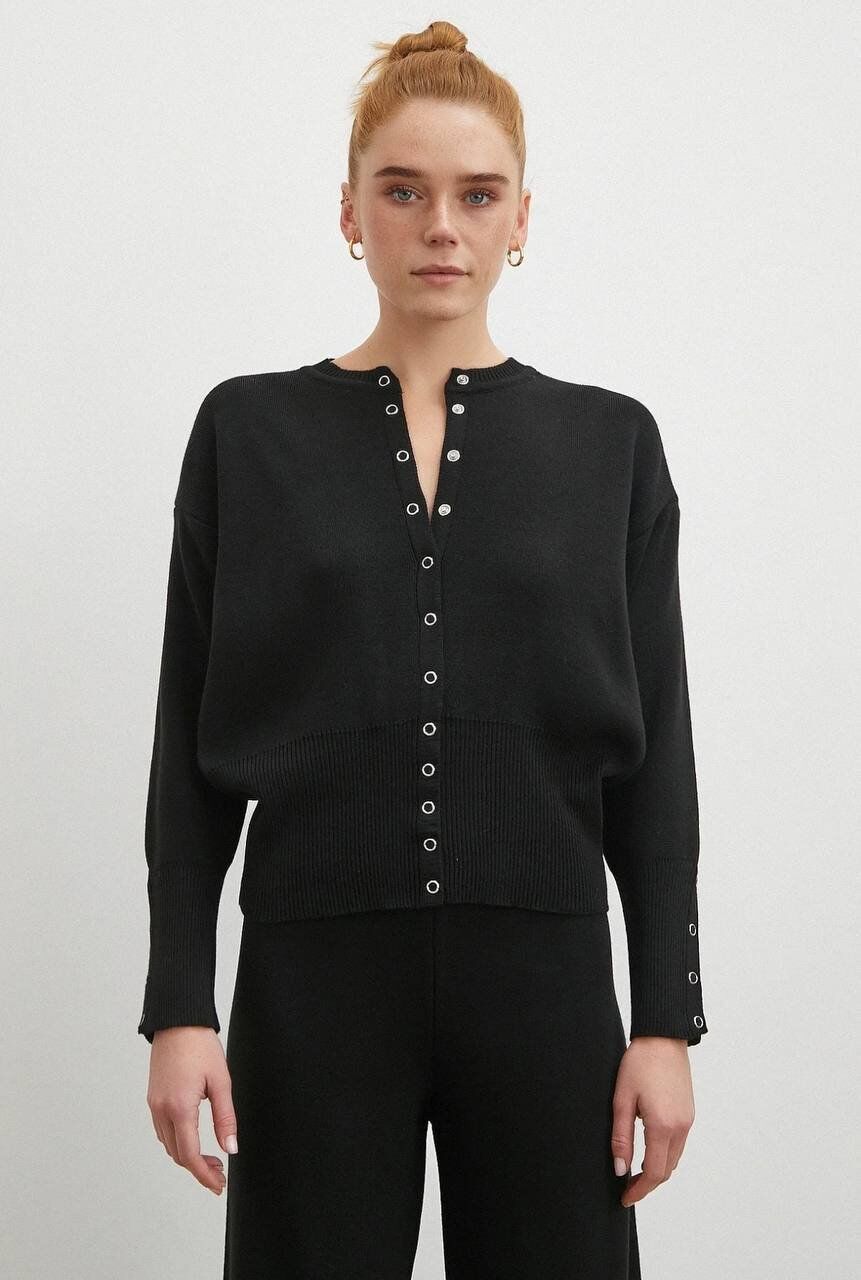 Tasarım: Bisiklet yaka hırka üzerinde ve manşetlerde yer alan gümüş renkli metal düğme/çıtçıt detayları takıma modern bir hava katar.