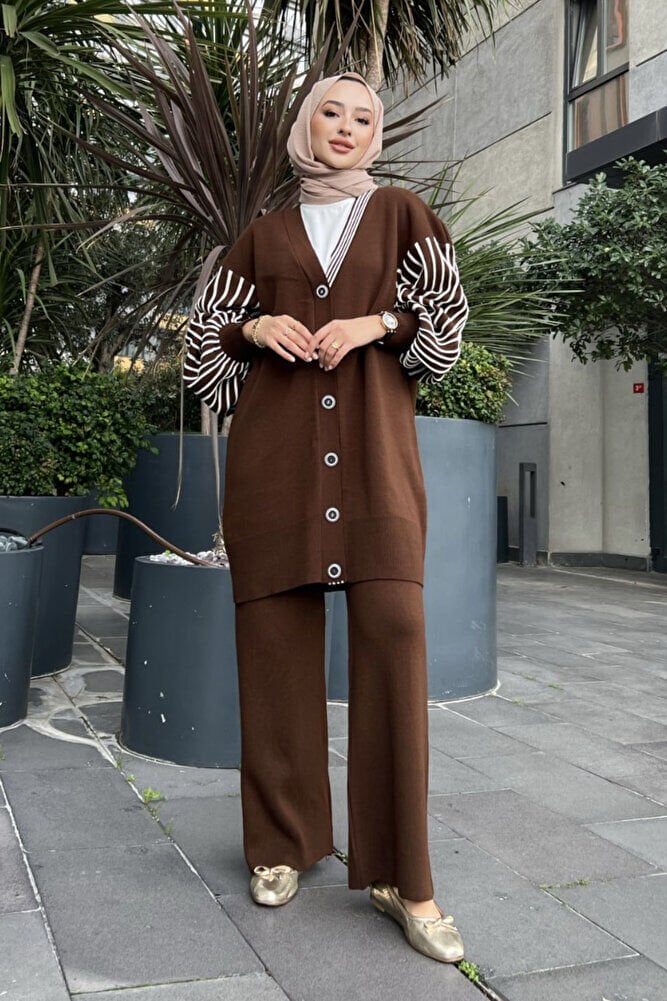 Kolları Çizgili Kahve Kadın Triko İkili Takım
