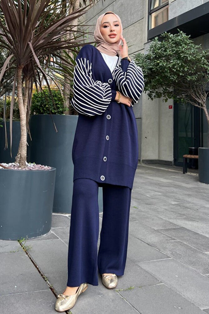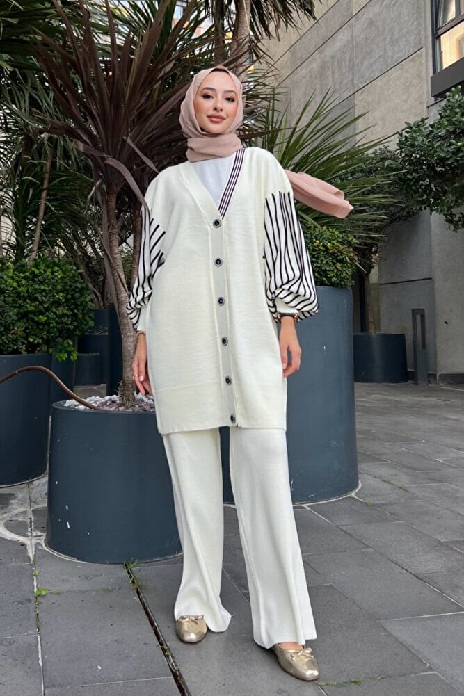 21; 40 yaş arası kadınların günlük kullanımına uygun, rahat ve şık bir tasarıma sahip; Kısa kollu ve balon kol detayları ile modern bir görünüm sunar; Orta kalınlıkta kumaşı sayesinde mevsim geçişlerinde ideal konfor sağlar; Casual ortamlarda rahatlıkla tercih edilebilecek, şıklığı ve rahatlığı bir arada sunan ikili takım; Yelekli pantolonlu alt; üst kombini ile tam bir tesettür giyim seti olarak öne çıkar; Yıkama talimatlarına uygun şekilde bakım yapıldığında uzun ömürlü kullanım vaat eder; V yaka tasarımı ile zarif bir boyun hattı oluştururken, akrilik dokuma tipi dayanıklılığı artırır; Uzun boy kesimi sayesinde vücut hatlarını nazikçe sararak feminen bir siluet çizer; Triko kumaşı yumuşak dokusuyla gün boyu konforlu bir deneyim sunar; Balon kalıbı ile trend bir görünüm kazandırırken, %70 akrilik ve %30 yün matery;