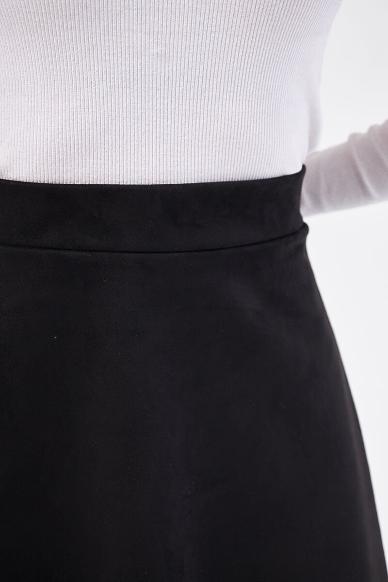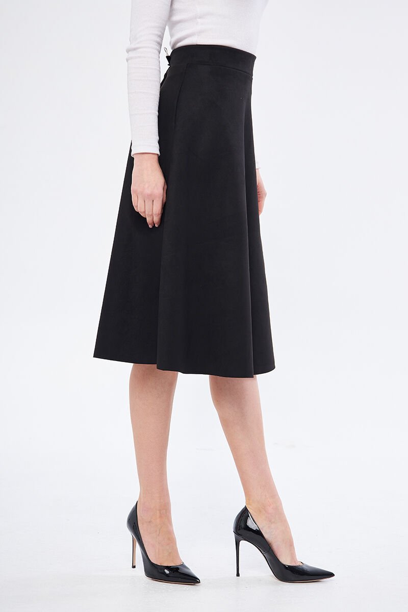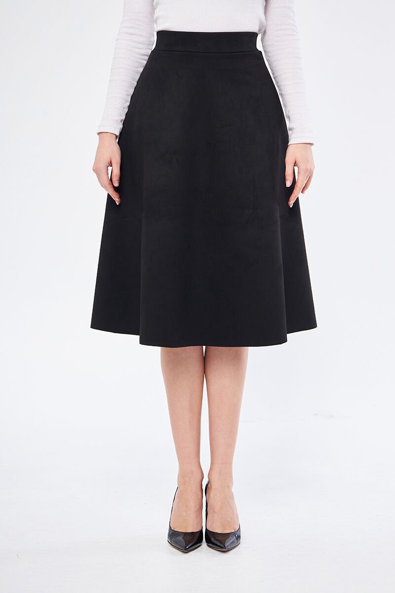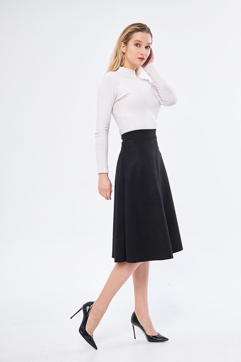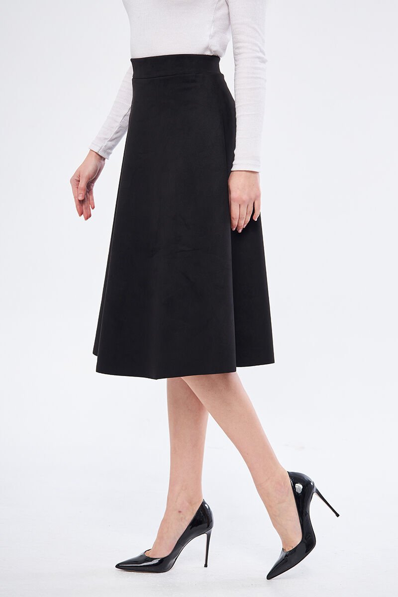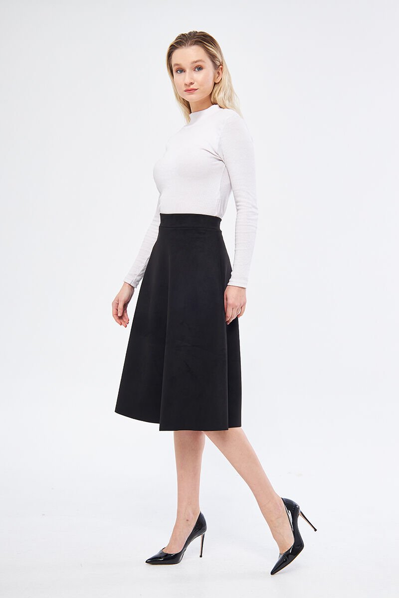 Yüksek bel tasarımı ile gün boyu rahat bir kullanım sunar ve vücut hatlarını zarifçe sarar; Midi boy kesimi sayesinde hem günlük hem de özel günlerde şık bir görünüm sağlar; Basic koleksiyonun sadeliğiyle her türlü üst giyimle kolayca kombinlenebilir; Suni süet detayları ile modern ve şık bir dokunuş katarken, kloş silueti hareket özgürlüğü sunar; Orta kalınlıkta kumaşı mevsim geçişlerinde ideal konforu sağlar; Kırışmaya dayanıklı yapısı sayesinde bakımı kolaydır ve uzun süreli kullanım için idealdir; Kazayağı deseniyle zamansız bir stil oluştururken, suni deri materyali dayanıklılığı artırır; %95 pamuk ve %5 likra içeriği ile yumuşak bir dokunuş hissi verirken esneklik kazandırır; Type1 yıkama talimatına uygun şekilde bakım yapıldığında formunu korur; Dokuma süet dokusuyla lüks bir görünüm sergilerken, dokuma kumaşı dayanıklılığı;