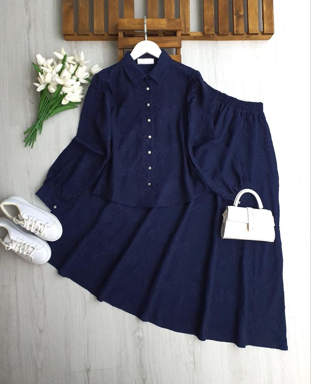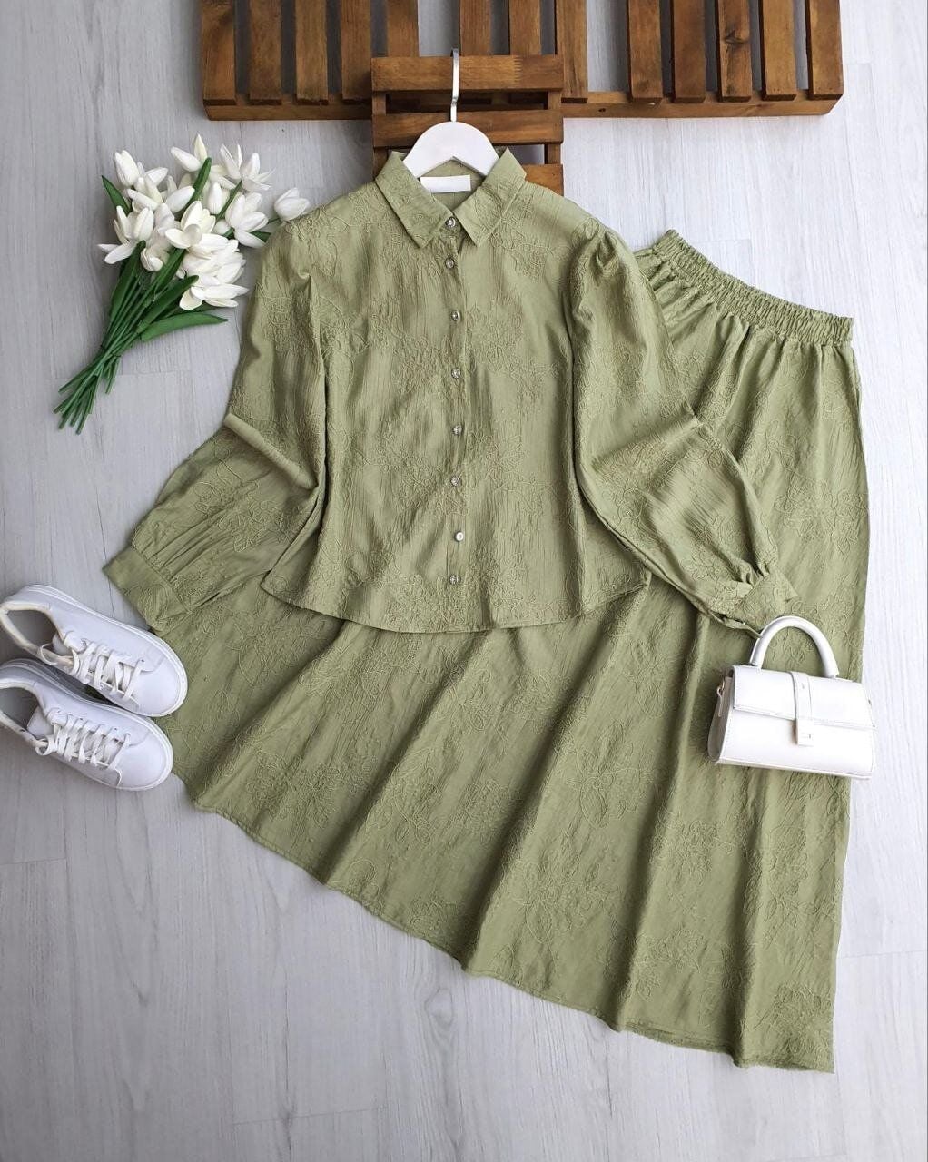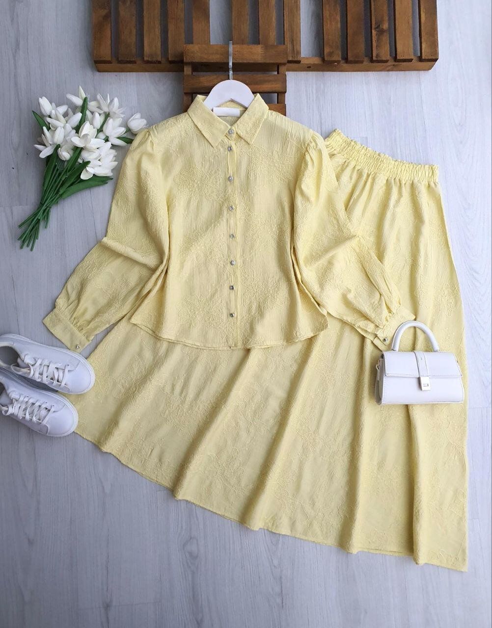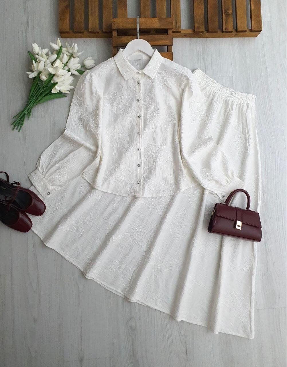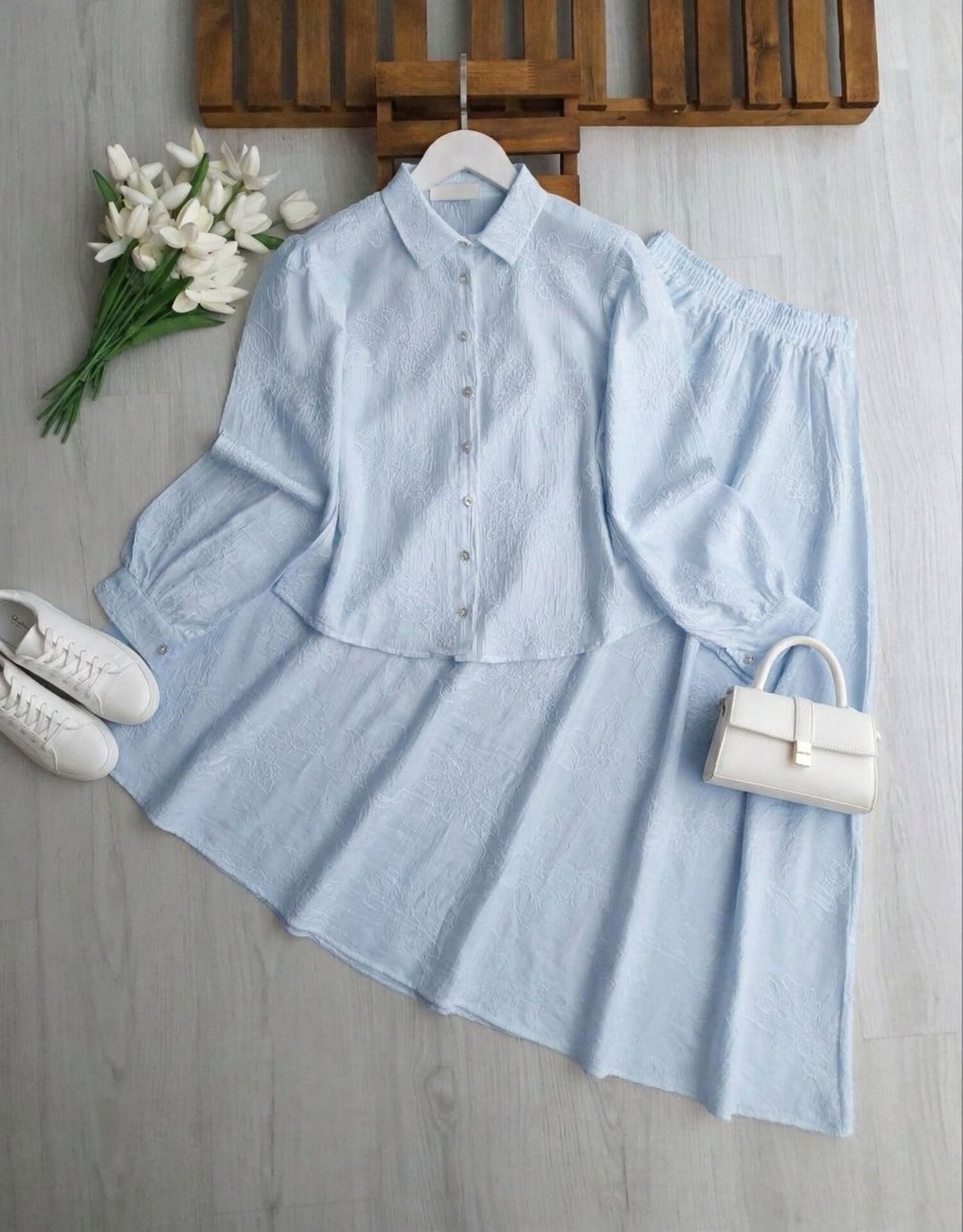 Zarif nakış dokusu ve dökümlü kumaşıyla şıklığı yakalayın! Hem günlük hem özel günler için ideal olan bu takım, konfor ve zarafeti bir araya getiriyor.