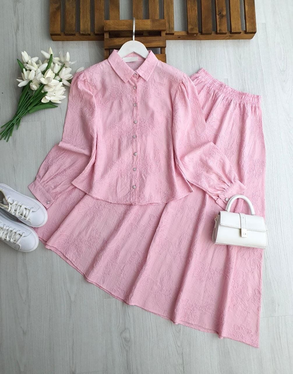 Nuzgi Kendinden Nakışlı Jakarlı Çilek Kumaş Takım