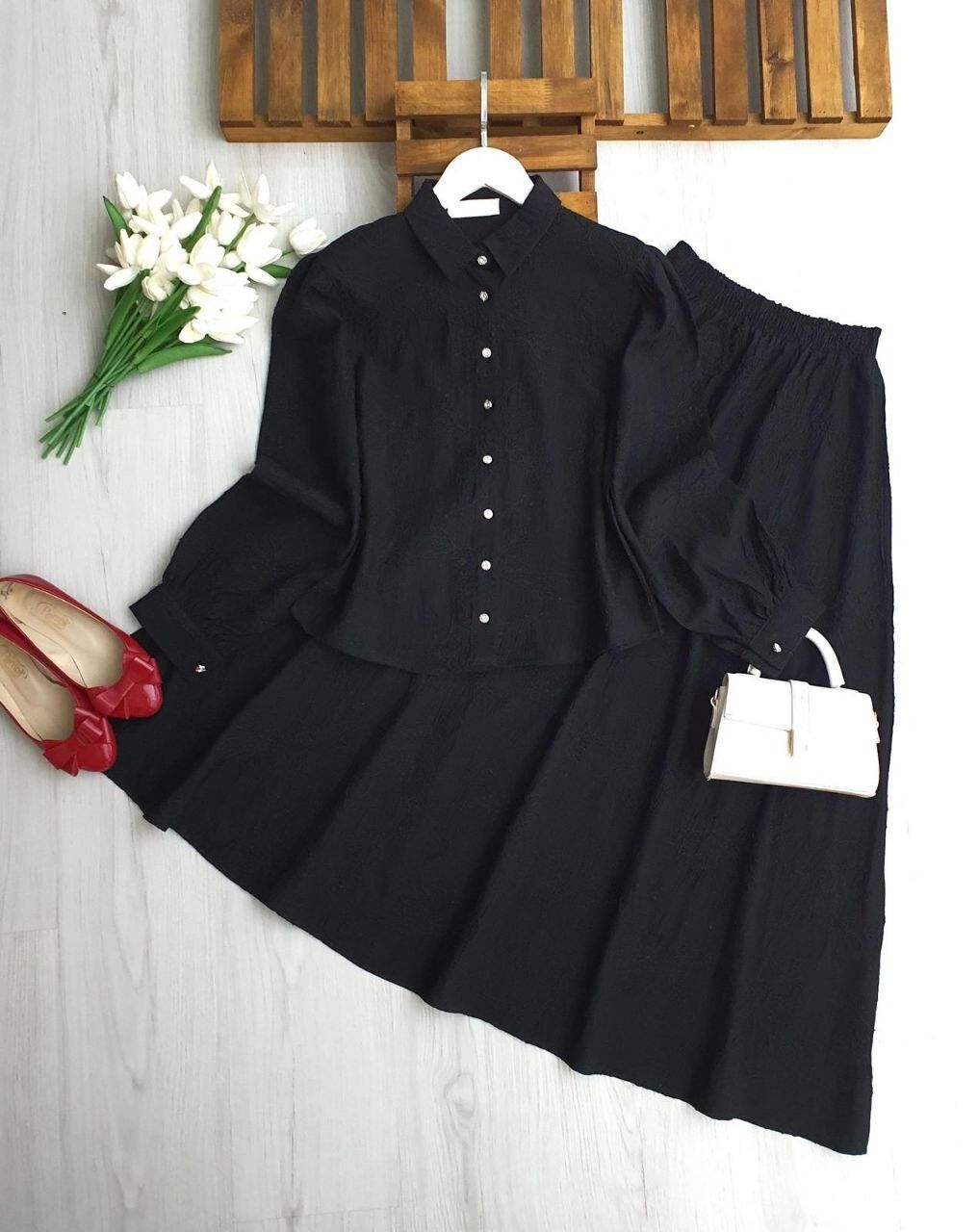Özellik: Beli lastikli etek, düğmeli şık gömlek.