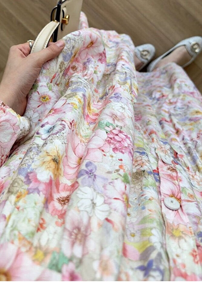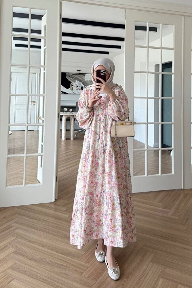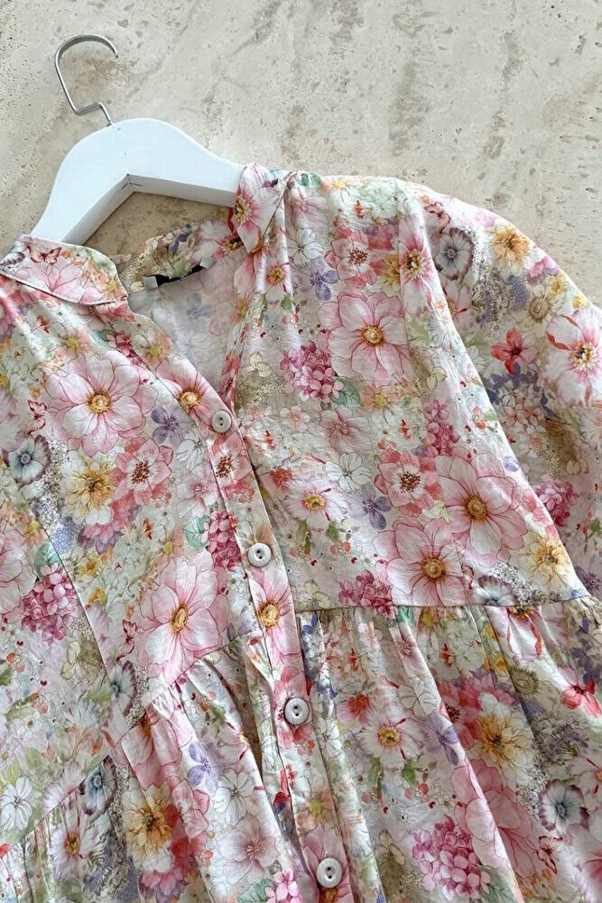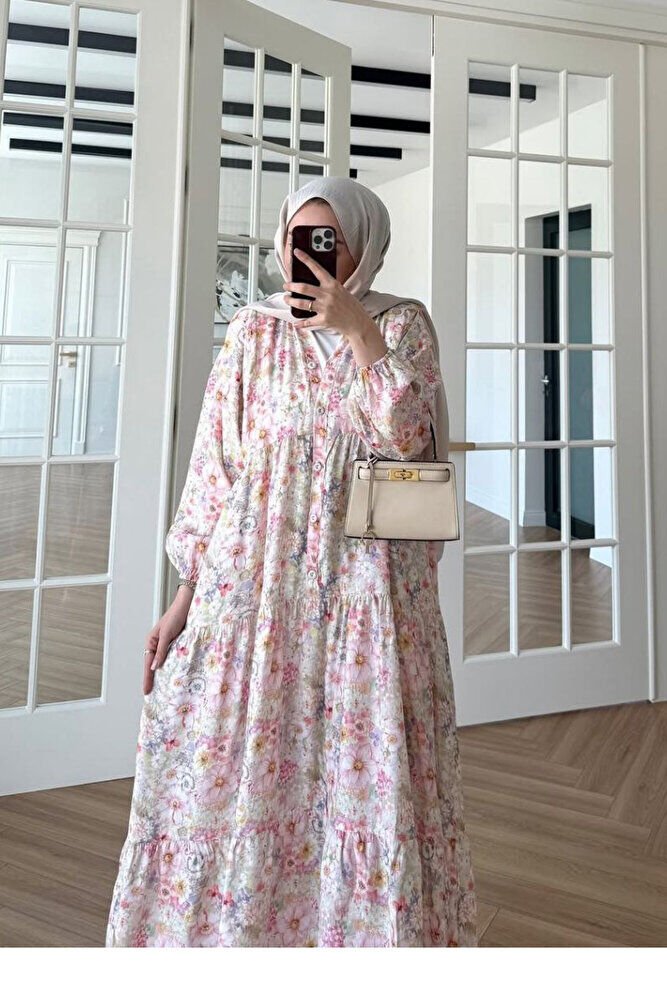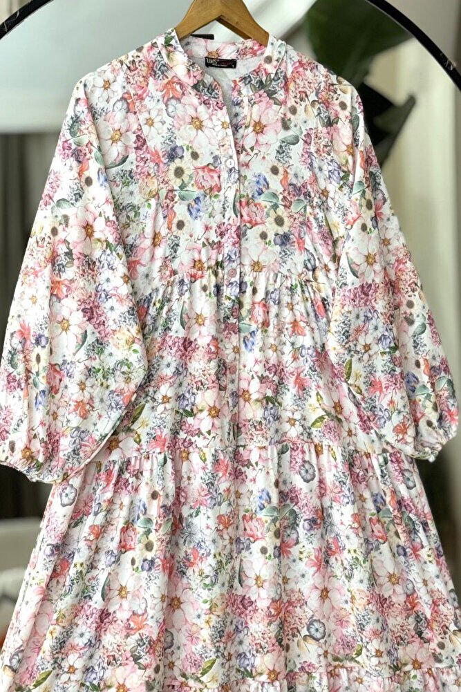 Patlı Yarım Düğmeli Çiçek Desen Elbise
