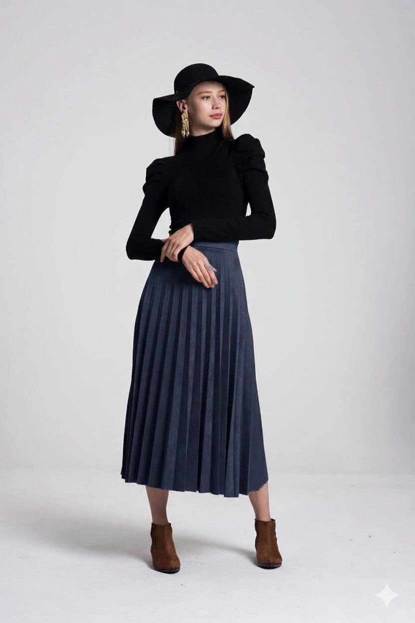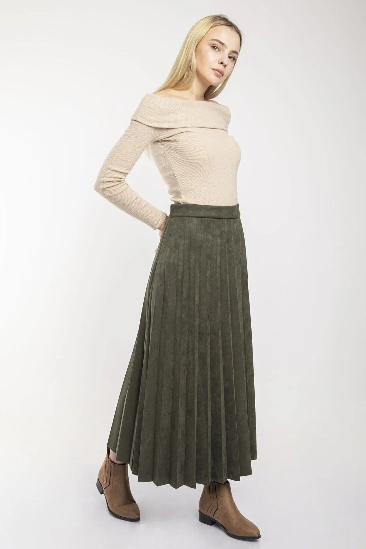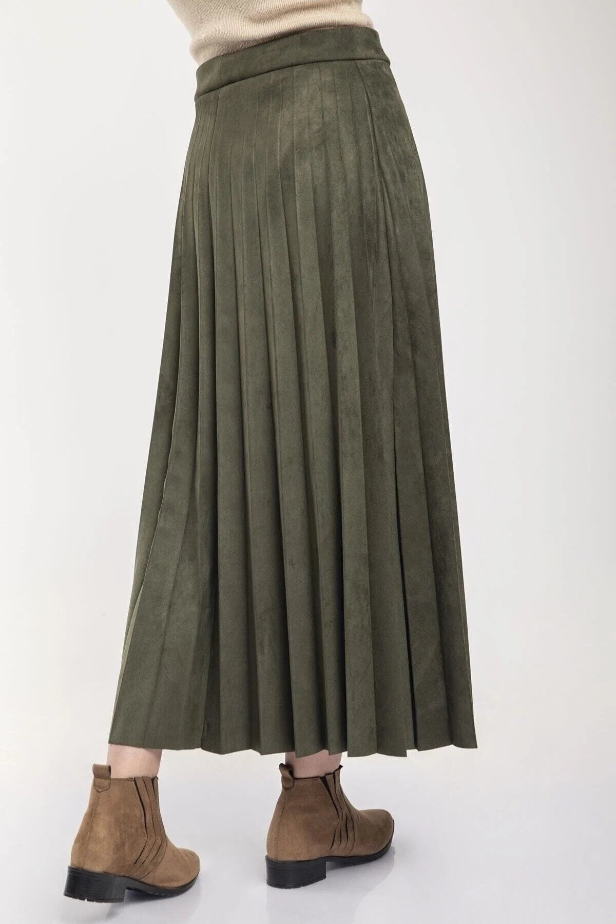 Gardırobunuzun zamansız ve en şık parçası olmaya aday olan piliseli süet eteğimizle tanışın! Süetin yumuşacık ve lüks dokusu, pilisenin hareketli ve zarif duruşuyla birleşerek her adımınızda size eşlik edecek.