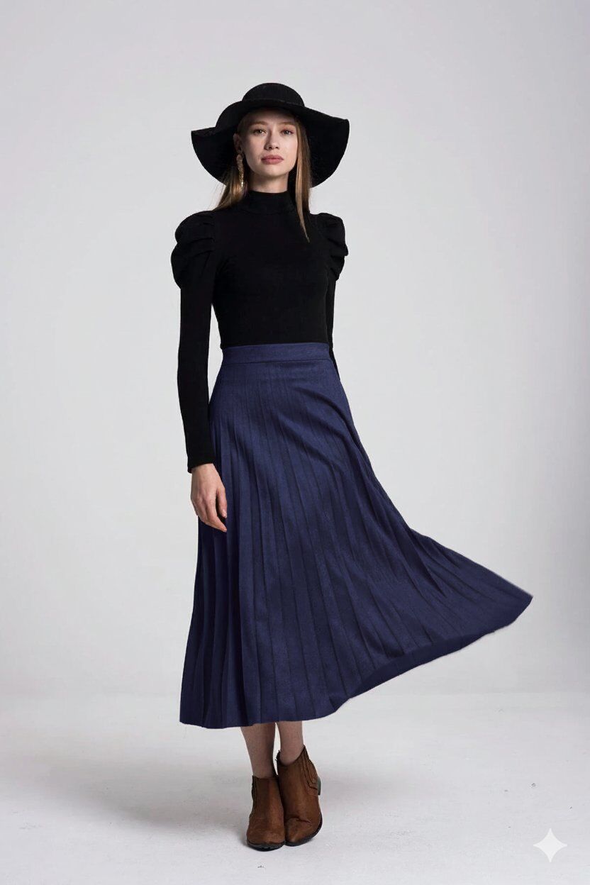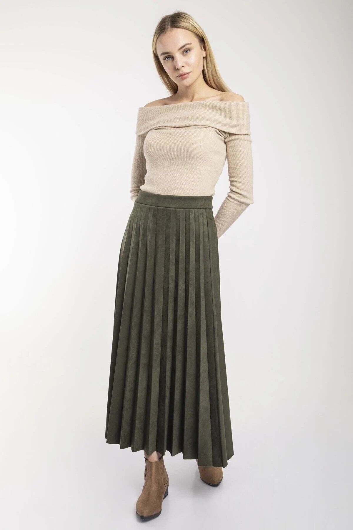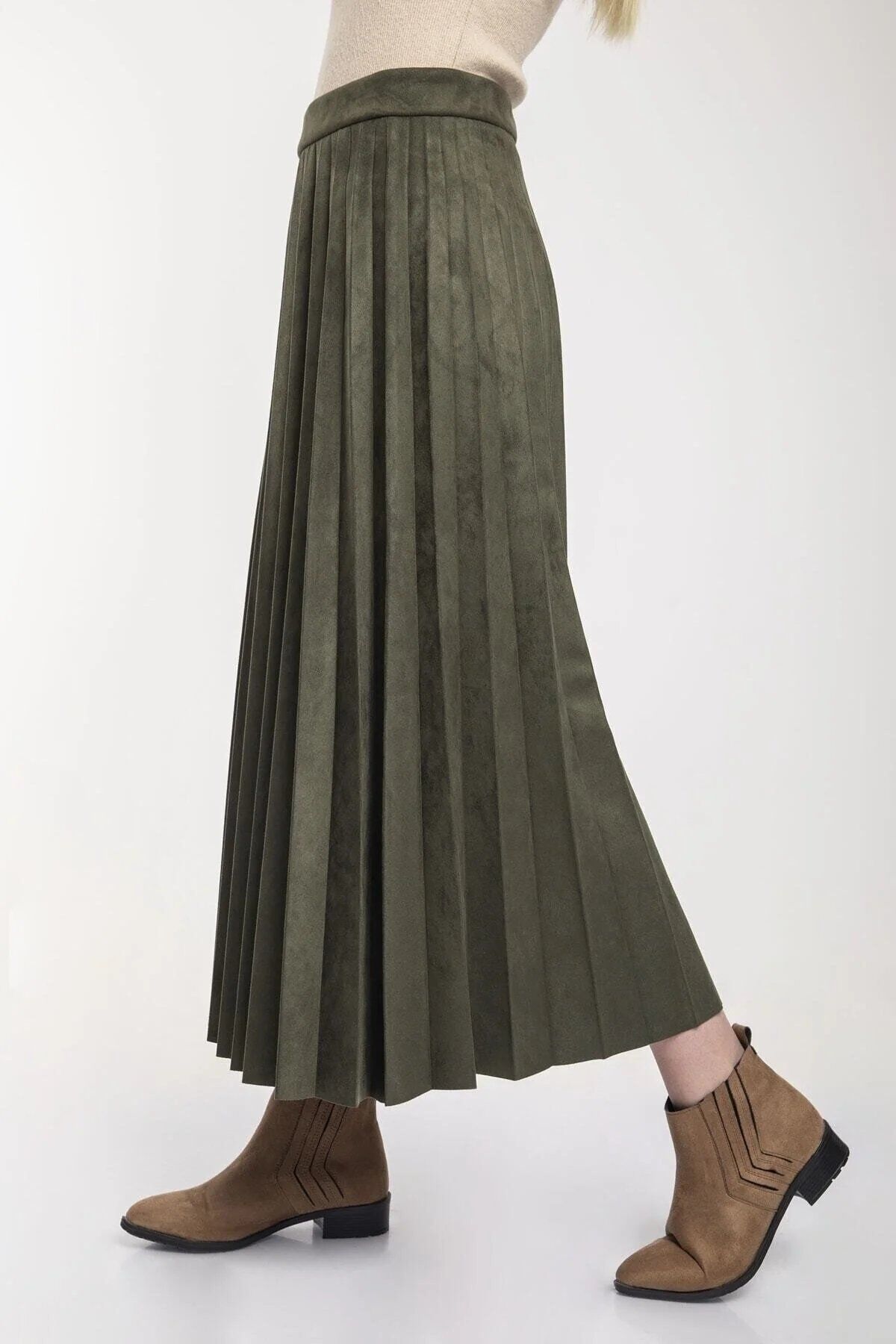 Gardırobunuzun zamansız ve en şık parçası olmaya aday olan piliseli süet eteğimizle tanışın! Süetin yumuşacık ve lüks dokusu, pilisenin hareketli ve zarif duruşuyla birleşerek her adımınızda size eşlik edecek.