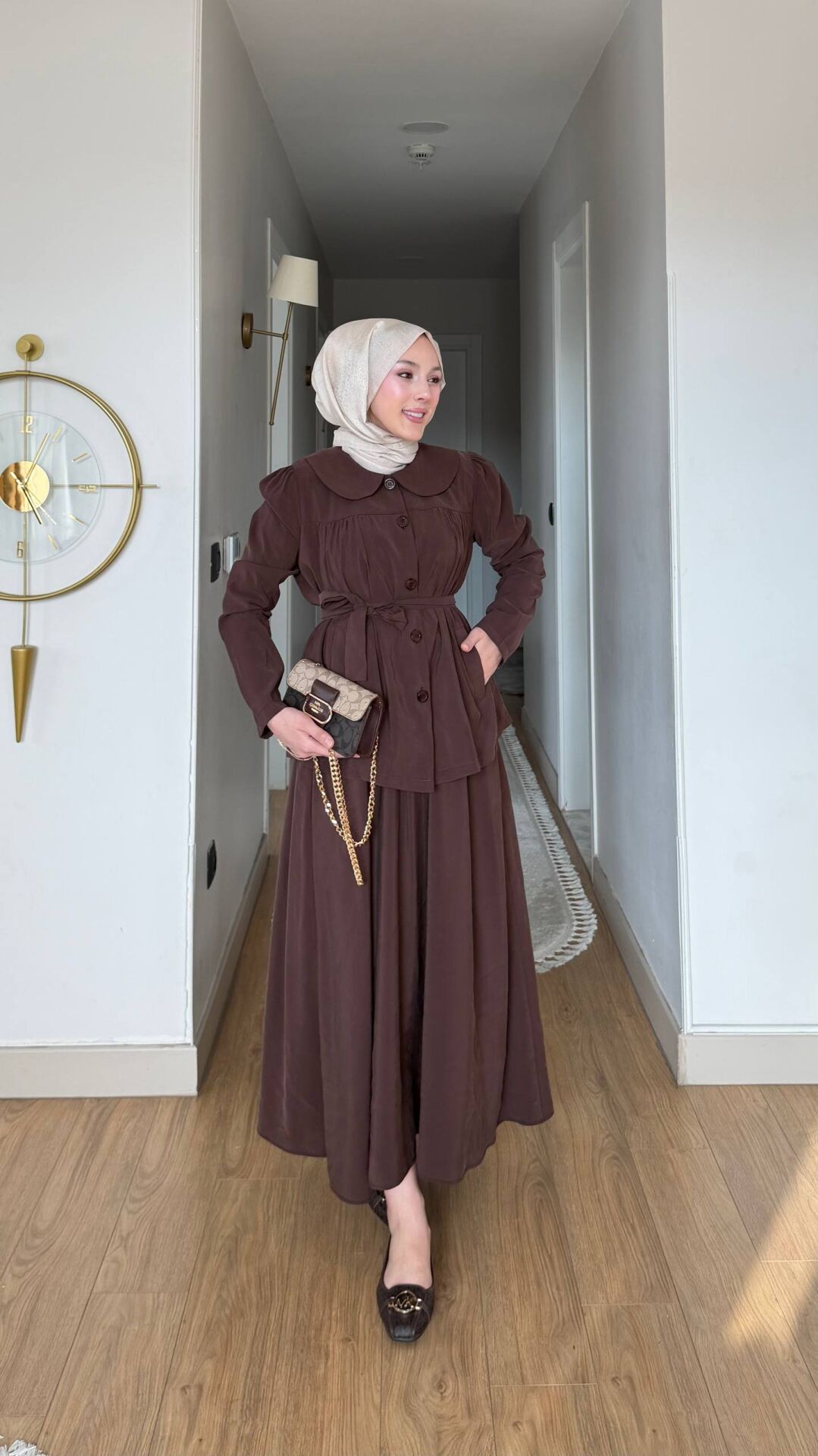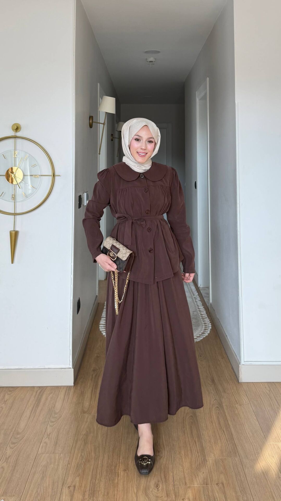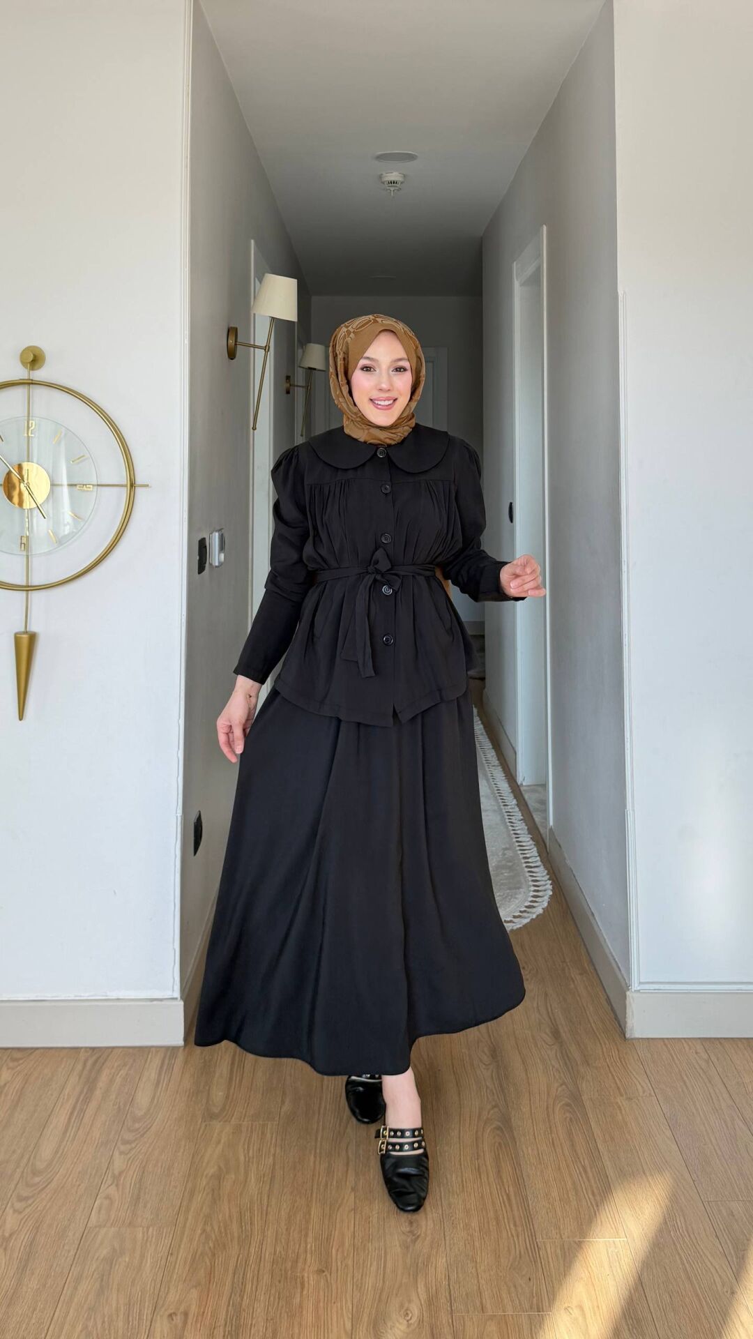 Modern muhafazakar stilin en şık hali! Geniş retro yaka detayı ve büzgülü omuz yapısıyla dikkat çeken bu ikili takım, belindeki ayarlanabilir kuşağı sayesinde zarif bir silüet sunar. Hem günlük kombinlerinizde hem de özel davetlerde konfor ve şıklığı bir arada yaşatır.