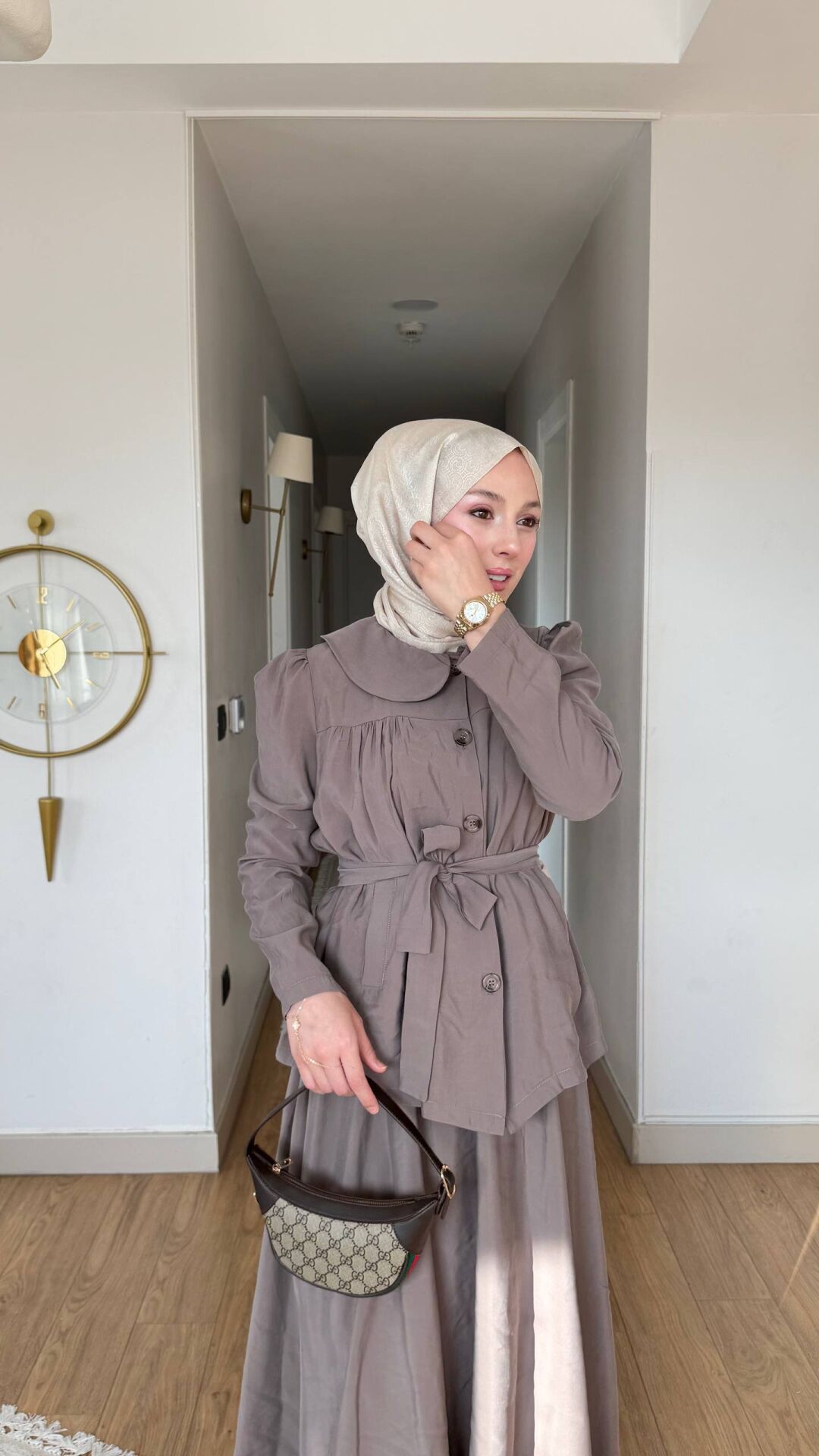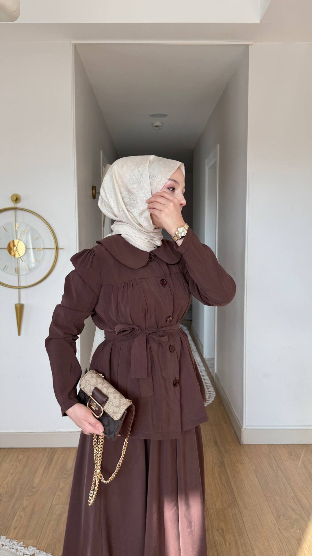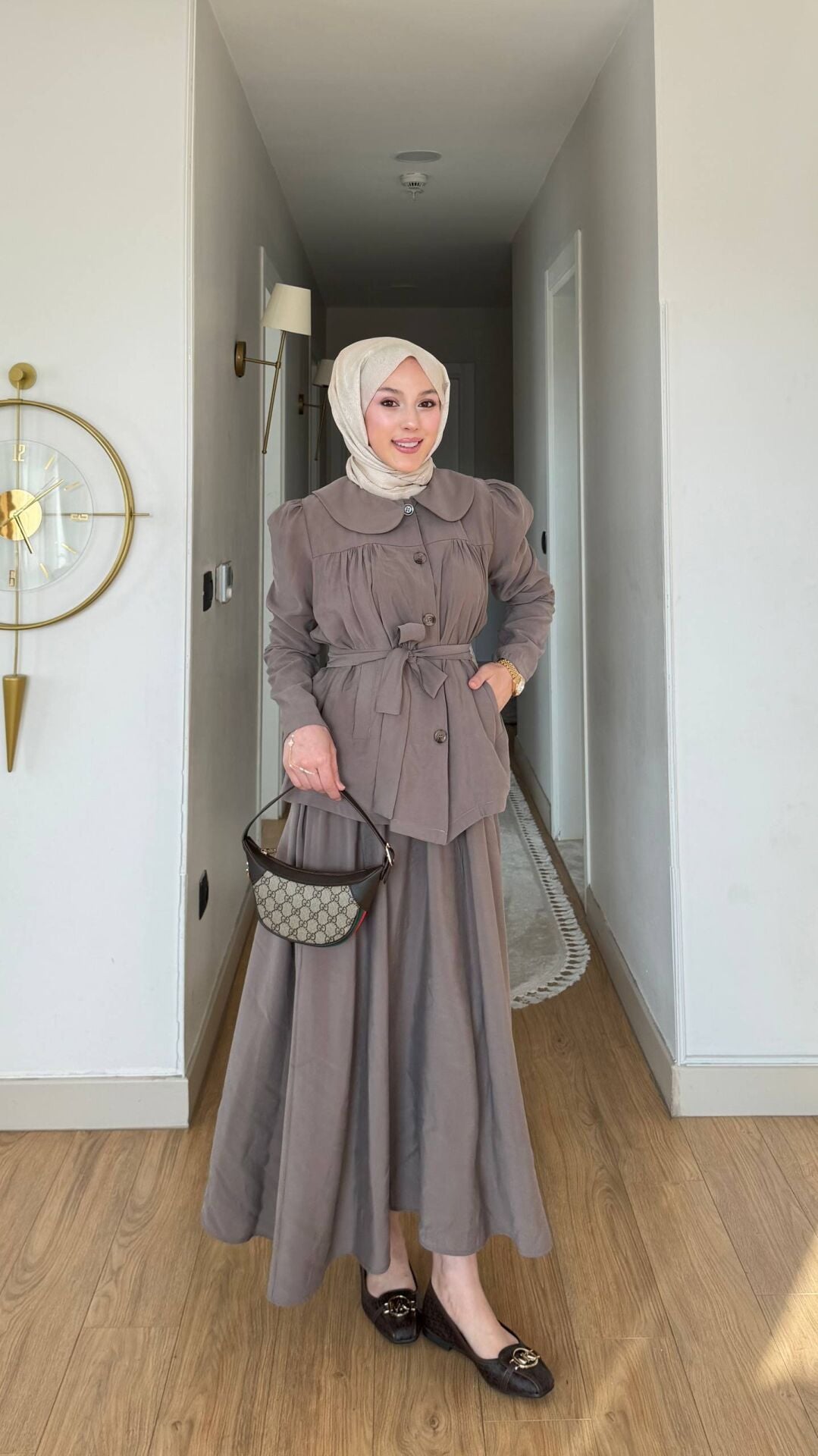 Modern muhafazakar stilin en şık hali! Geniş retro yaka detayı ve büzgülü omuz yapısıyla dikkat çeken bu ikili takım, belindeki ayarlanabilir kuşağı sayesinde zarif bir silüet sunar. Hem günlük kombinlerinizde hem de özel davetlerde konfor ve şıklığı bir arada yaşatır.