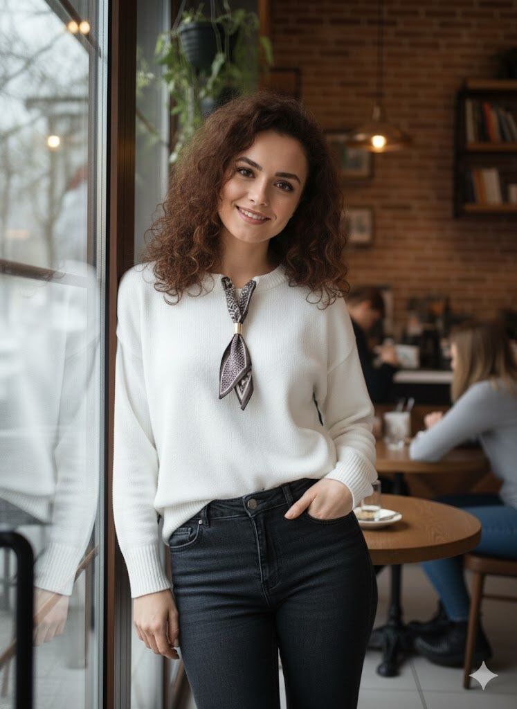 Tasarım: Yaka kısmında sabit fular görünümü ve şık metal toka aksesuarı.