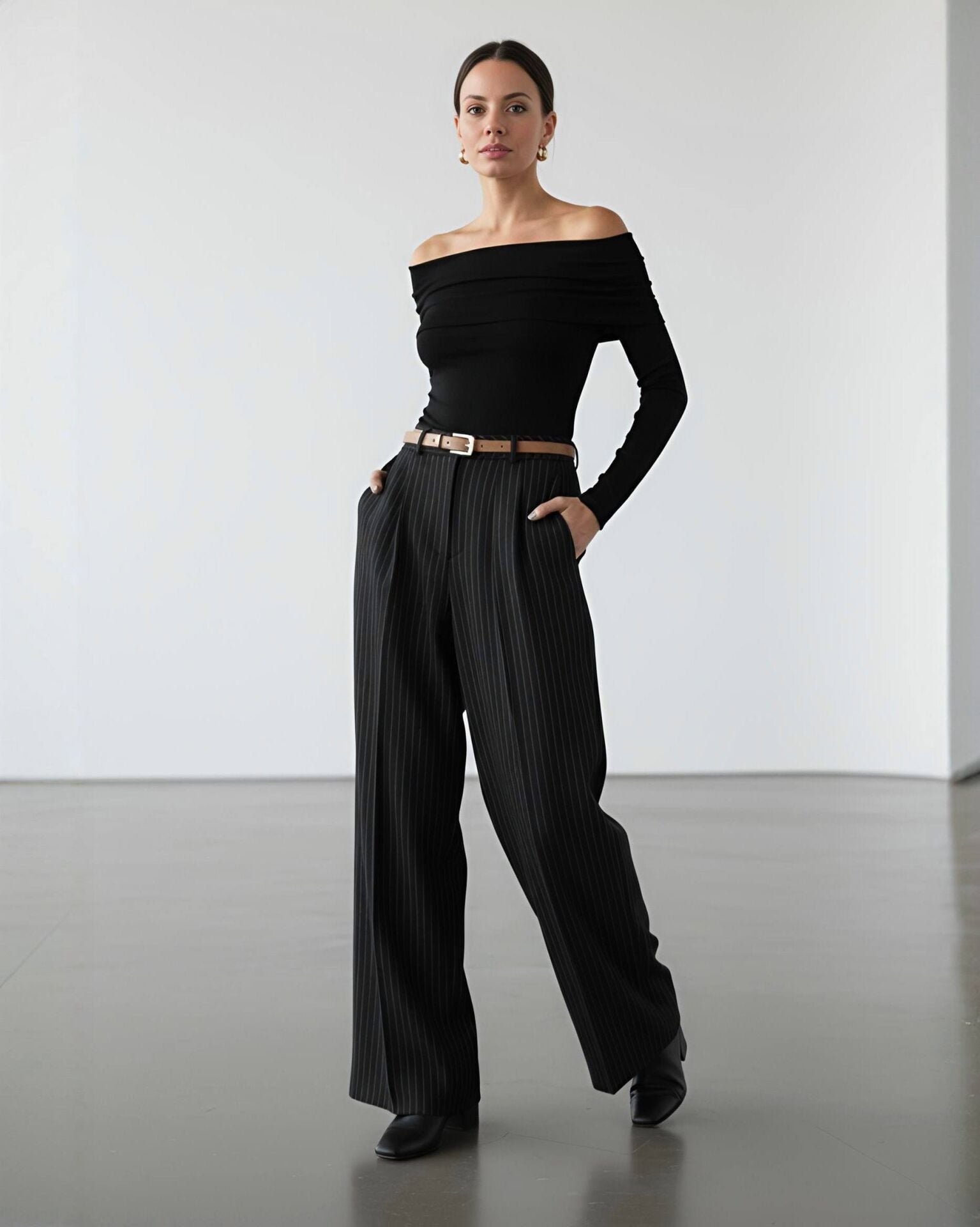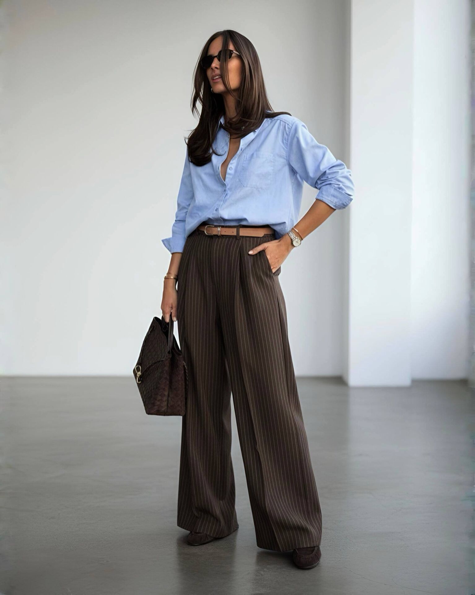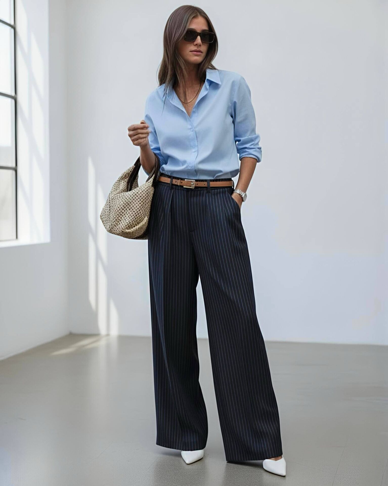 Zarafeti ve konforu bir araya getiren çizgili palazzo pantolon, gardırobunuzun en joker parçası olmaya aday. Maskülen pinstripe (ince çizgi) deseniyle profesyonel, dökümlü kesimiyle ise modern bir silüet sunar.