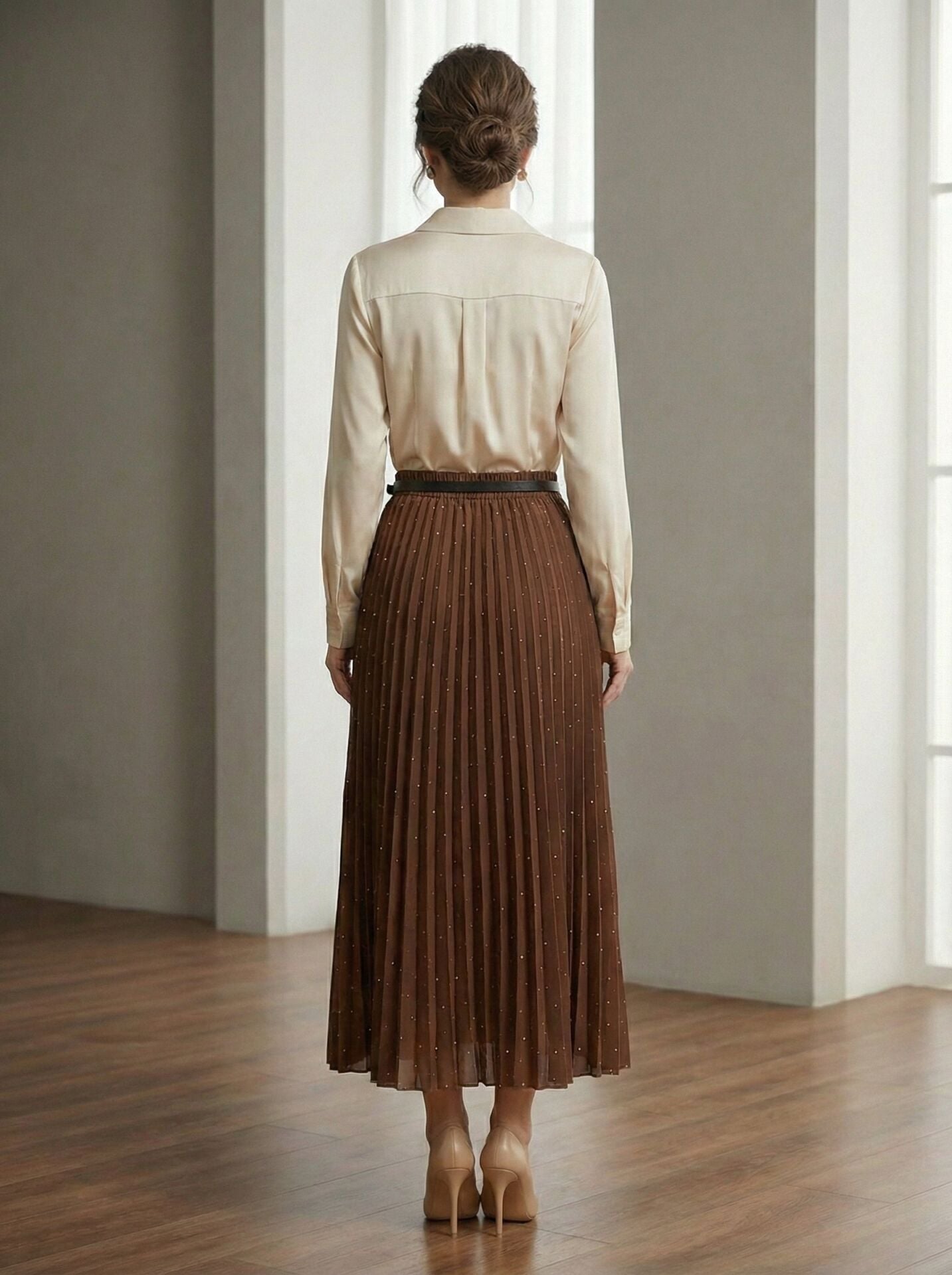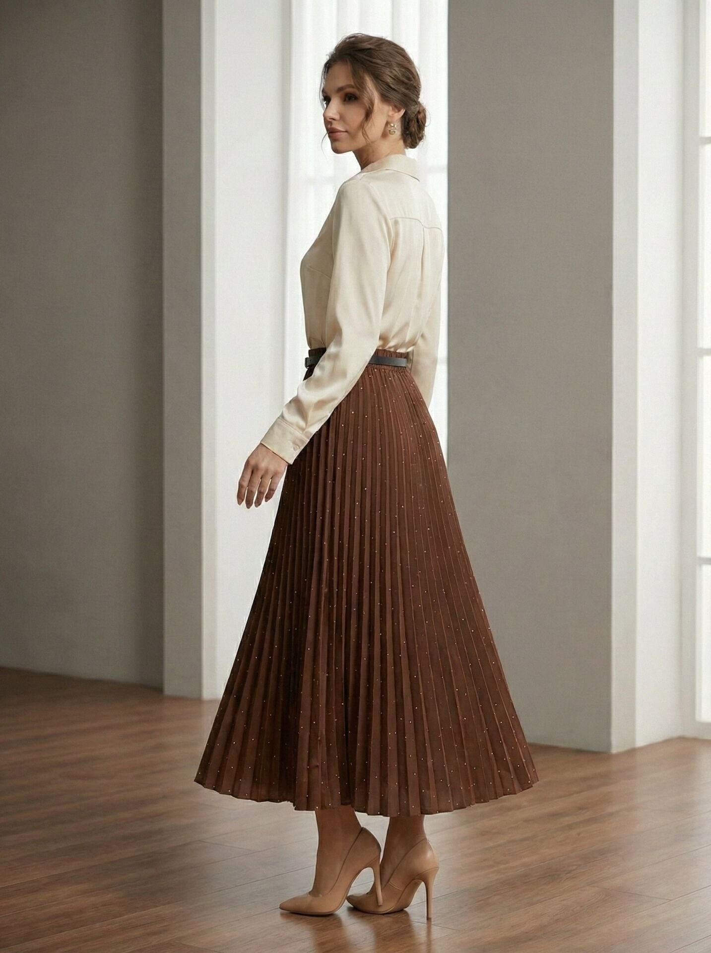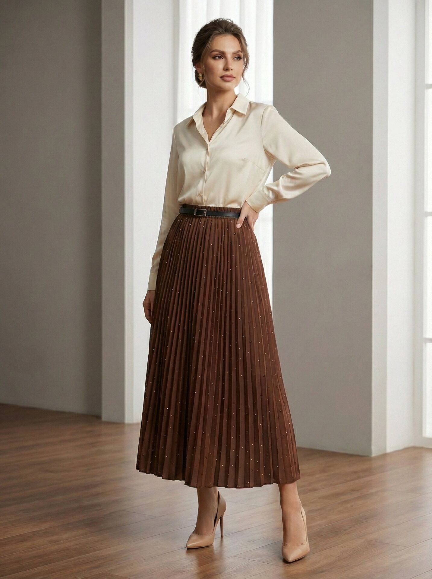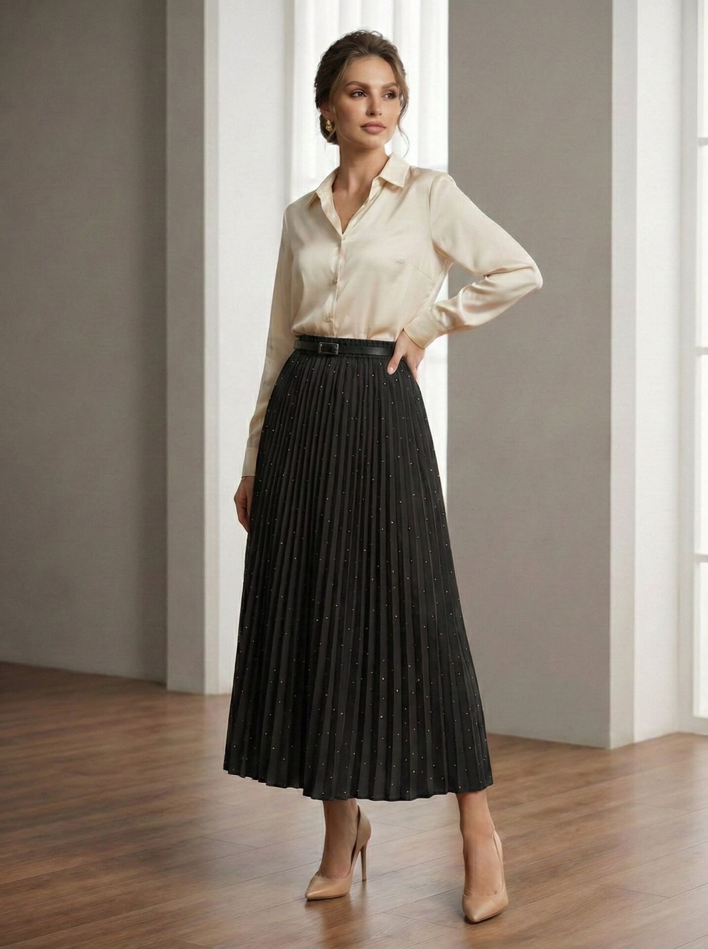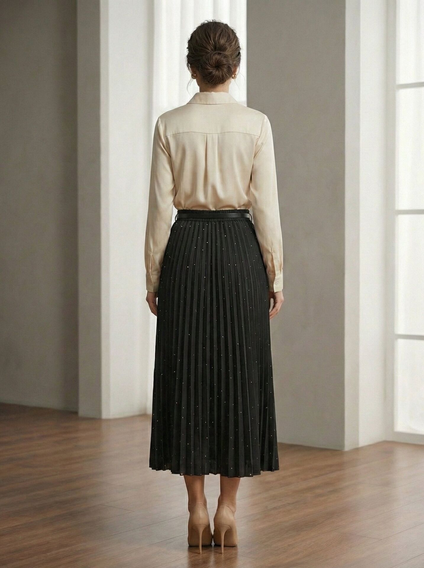 Şıklığı ve zarafeti tek bir parçada buluşturan Taş Detaylı Pileli Etek, gardırobunuzun en göz alıcı kurtarıcılarından biri olmaya aday! Uçuş uçuş dökümlü kumaşı ve kusursuz pileleriyle her adımda feminen bir duruş sergilerken, üzerindeki minik taş işlemeleriyle kombininize zarif bir ışıltı katar.